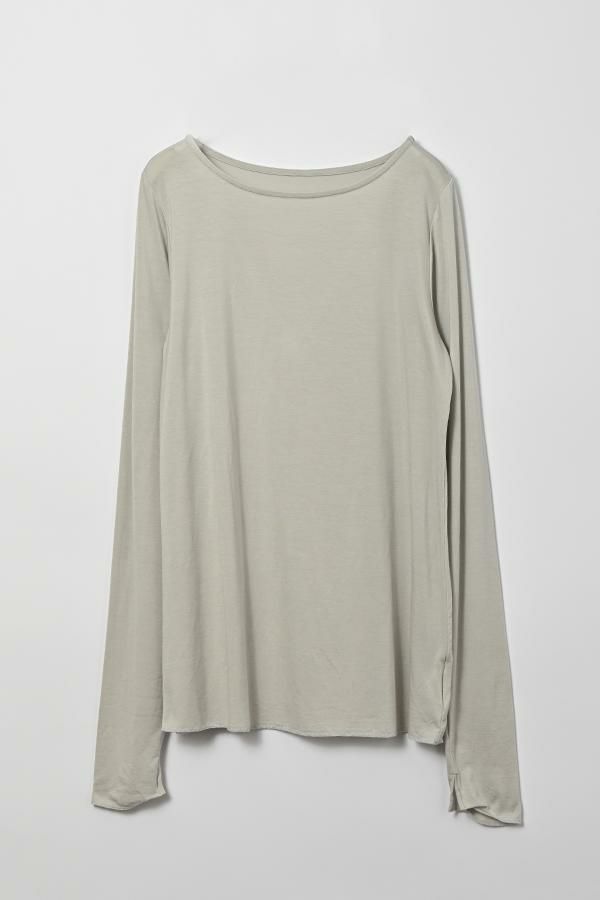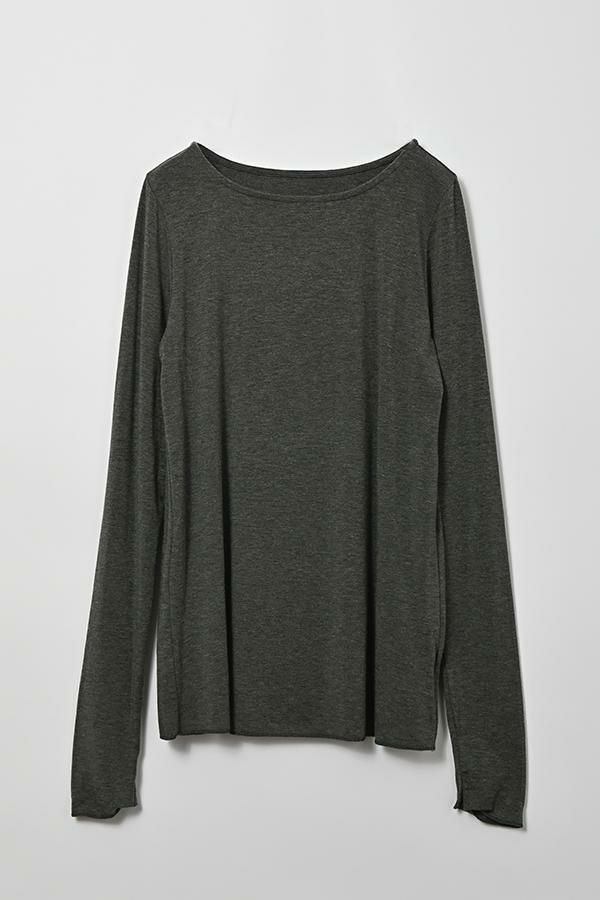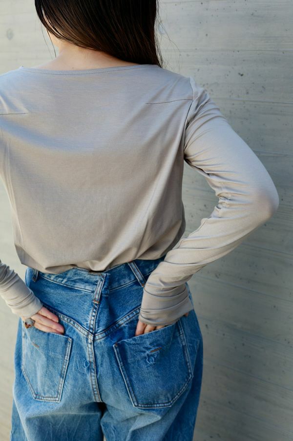 ANGELINA定番 クルーネックロンTEEの登場です!ぬめり感のある上質なテンセルで編まれたベア天竺です。 しっとりした肌触りでとでも柔らかく、保湿性、吸湿性を持ち速乾性が高い素材なので一日中快適なまま過ごせます。 絶妙な透け感が洗練された大人な印象を与えてくれます。シアー素材は色ものでも強くなり過ぎず着回しも利くので差し色として取り入れても上品さを保ち、ベーシックカラーは統一感を持たせるアイテムとしても◎ ジャケットに合わせた時の見え方に拘った首元のあきがポイント。 長めに設定した袖丈は自在に設定出来て万能です。袖口のスリットのさりげなさが使えます! ジャケットなどトラッドなスタイリングにシアーのインナーを持ってくることでソフトなイメージを持たせてくれます。 カジュアルなトレーナーなどとレイヤードする場合は袖口からフリルっぽく見せるディテールコーデで女性らしいワンポイントに。 ●日本製