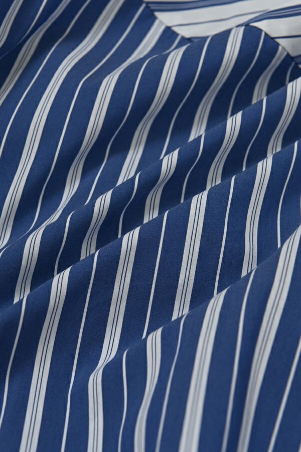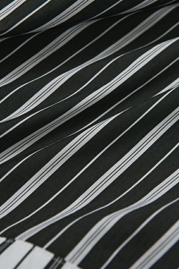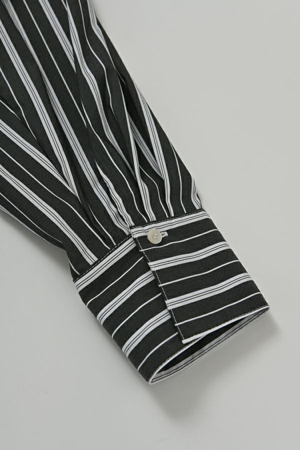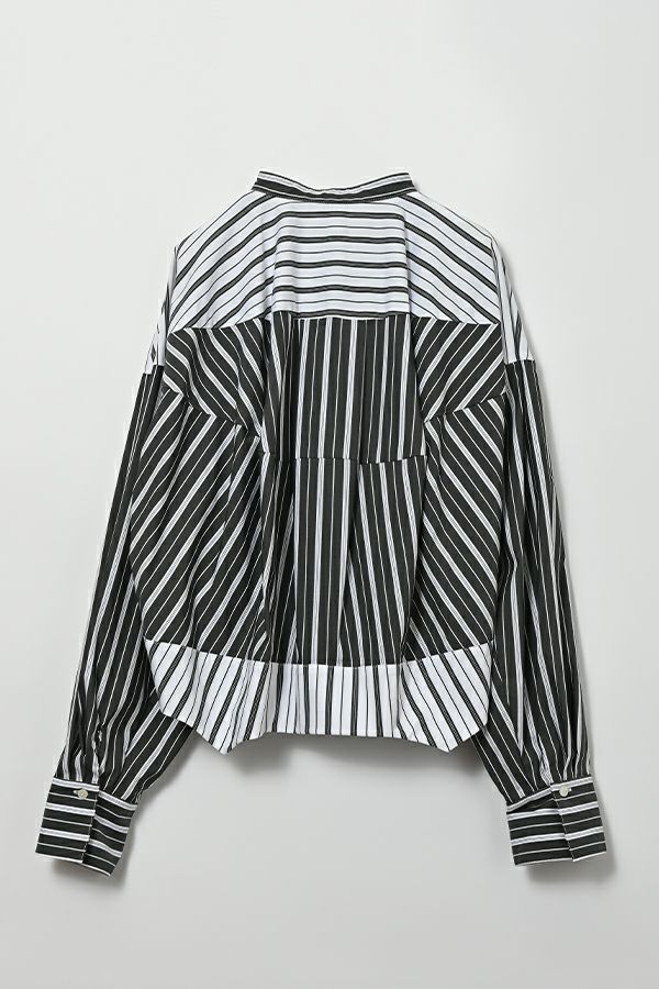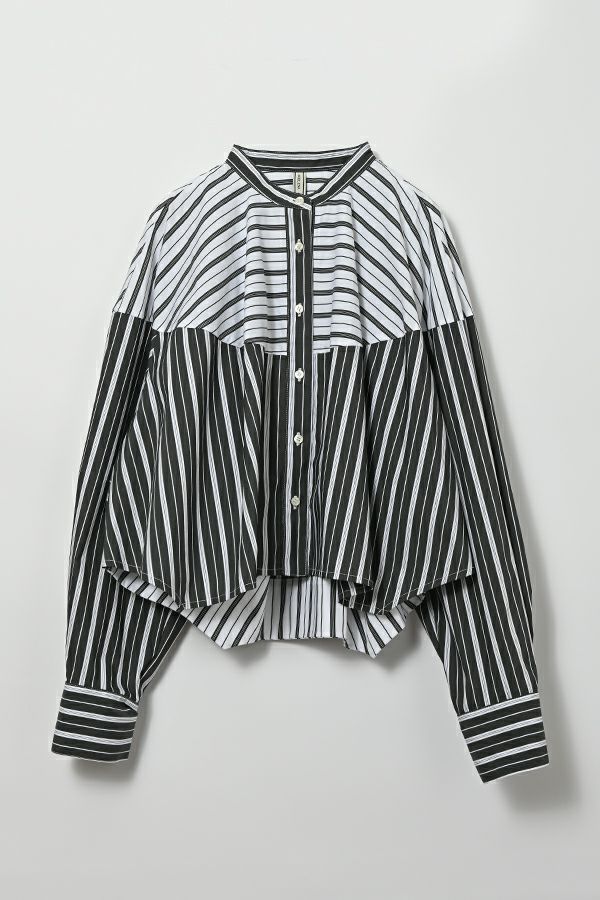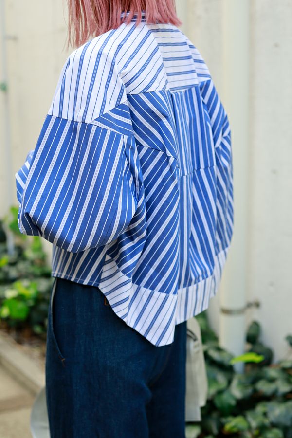 「1枚で主役級!」立体感が際立つシャツブラウス。 2配色のストライプ使いのインパクトに加え、フレアーの入れ方と切替が立体的な構造が、まるでランタンを思わせるような特徴的なシルエットに仕上がりました。 短丈でシャツ地を使用しているので、風通しも良く軽やかに着用頂けます。ワンピースなどに合わせる羽織としてもスタイルアップ効果を維持してくれ、シルエットにメリハリが出てこなれ感を演出できます。 短丈のトップスはバランスが取りやすいのでどんなボトムにでも相性良◎ ●同型で無地タイプ(25153-4025P)も有。