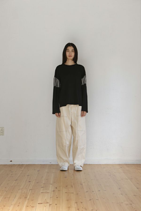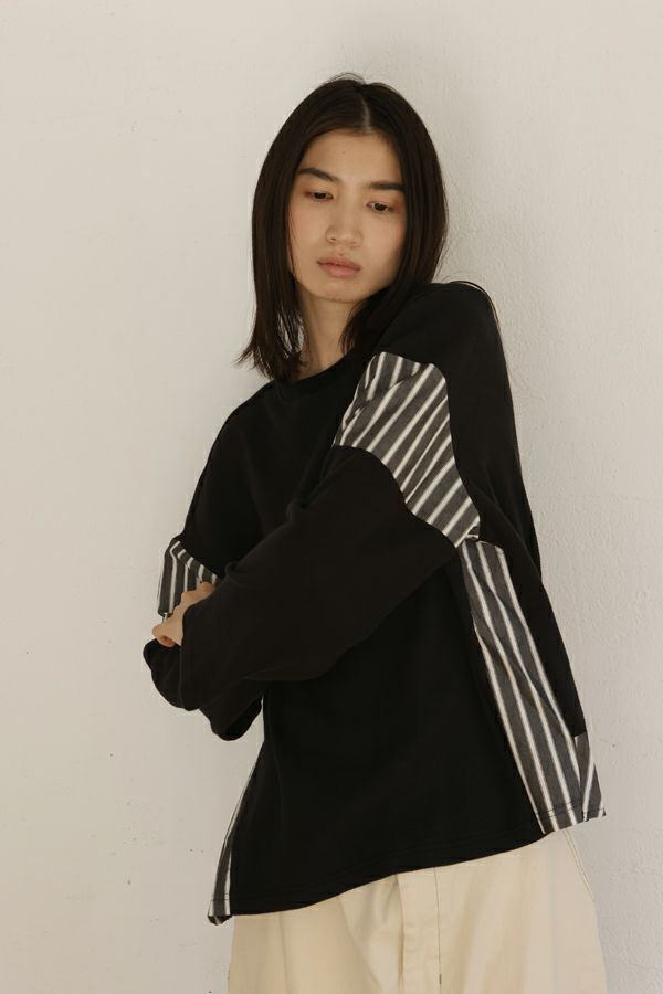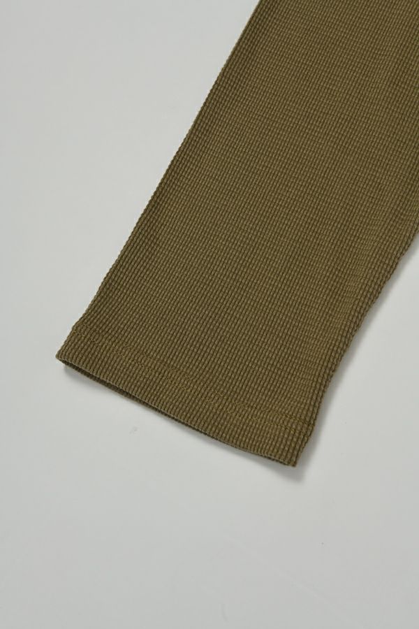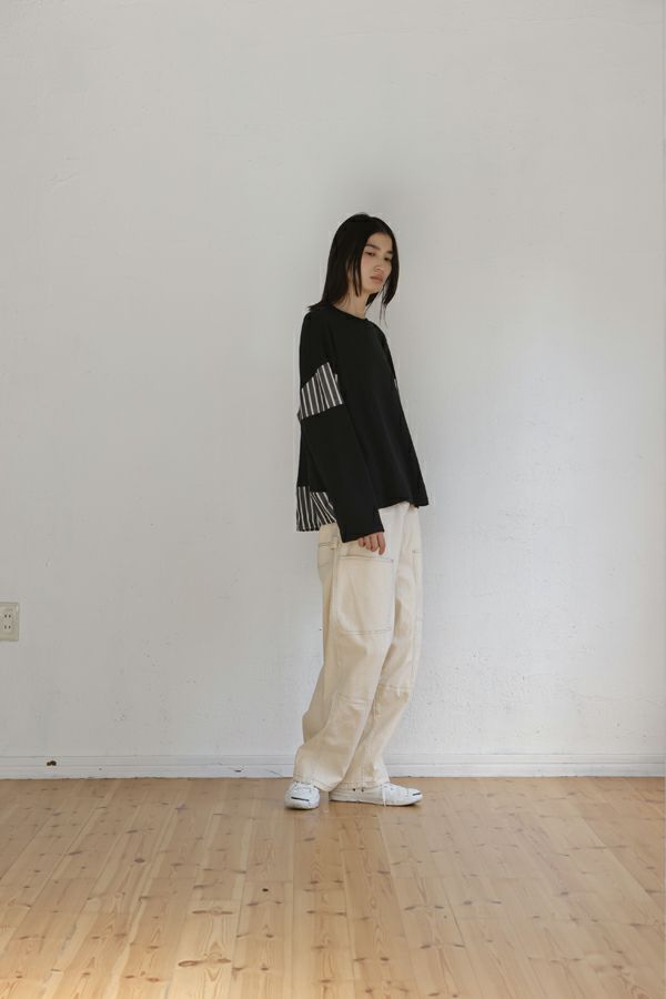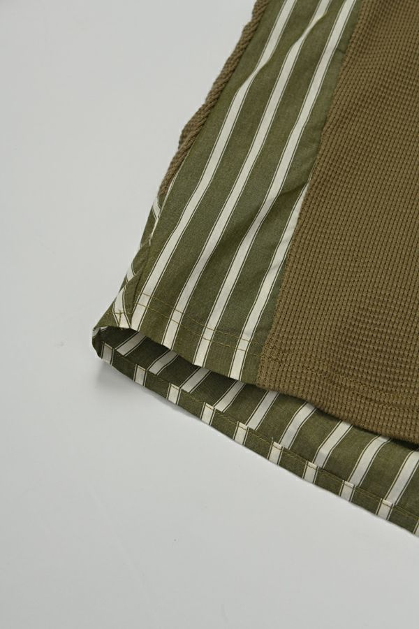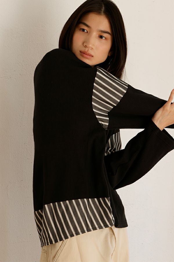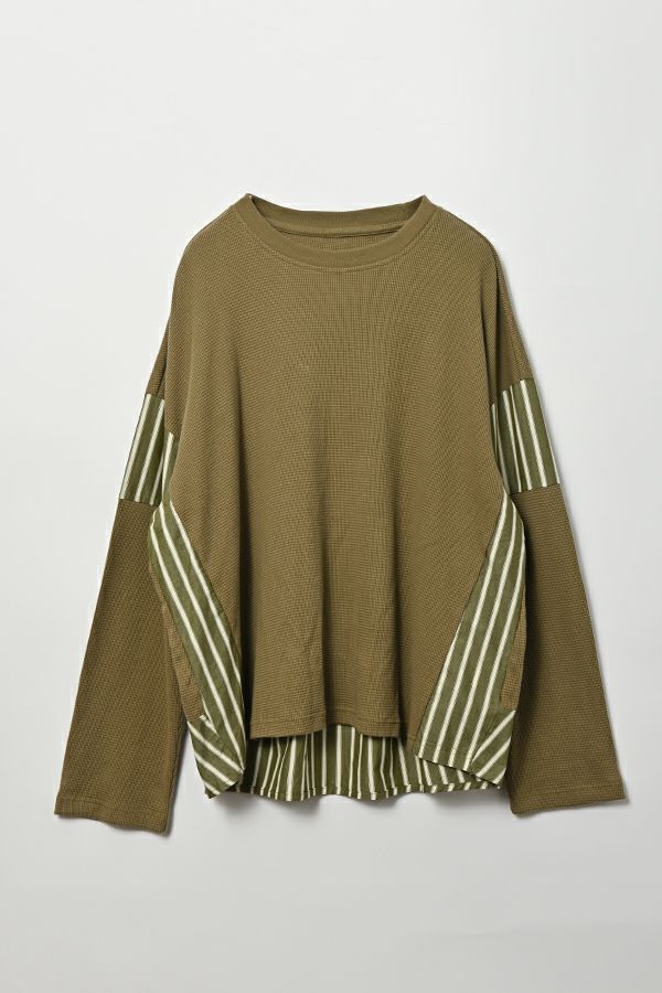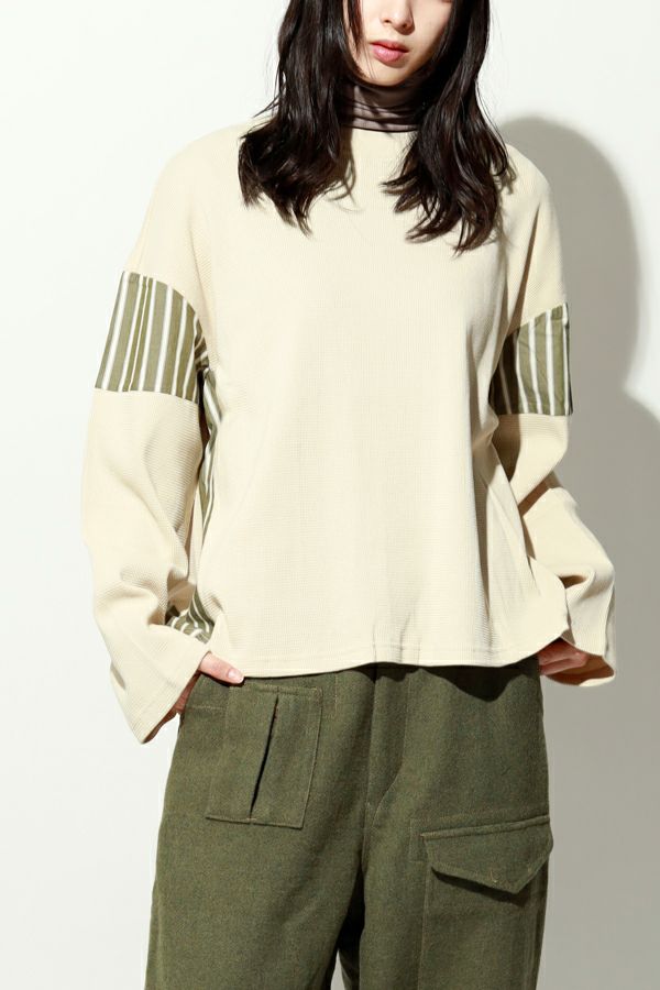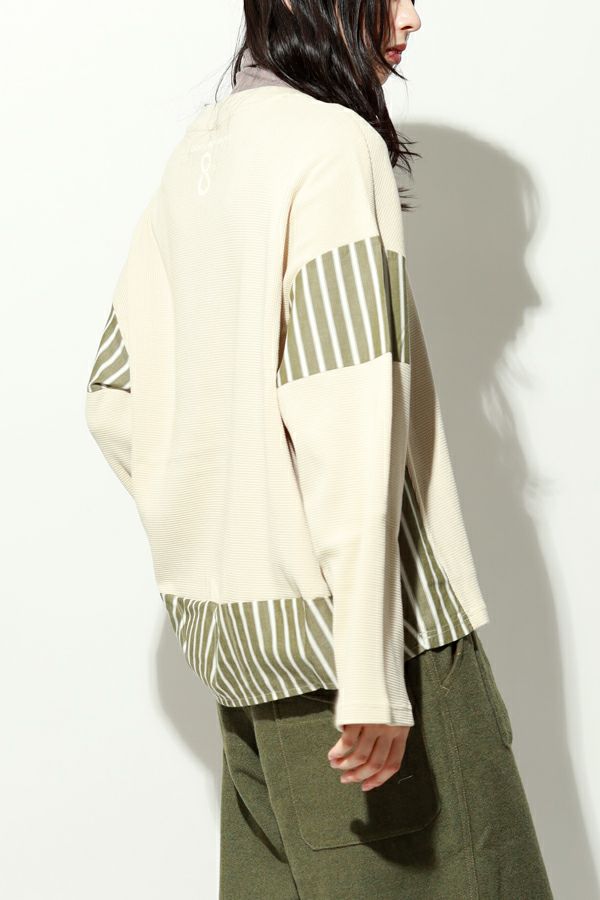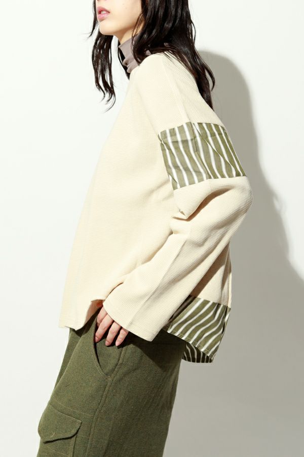 視線集める、大人な異素材MIXプルオーバー。 凹凸感のあるコットンサーマル素材は、吸水性や吸湿性に優れていて汗をかいてもベタつかず、空気が通るので通気性素材もあり、快適に着られます。 メンズっぽい雰囲気のある素材を使用しています。部分的に使用したストライプが視線を集め、華奢見え効果もプラスされた技ありな仕掛けに。 ヒップ部分にカープができるパターン設計で、広がらず、体になじんだシルエットになっています。 ゆったりとした素材は、袖をロールアップして着用してもらうのがお勧めです。 ●バックプリントは、ロデオに関連した8秒の数字と名言が記載されています。 「Its not my first RODEO」・・・前にもあったことだから大丈夫さ、の意。