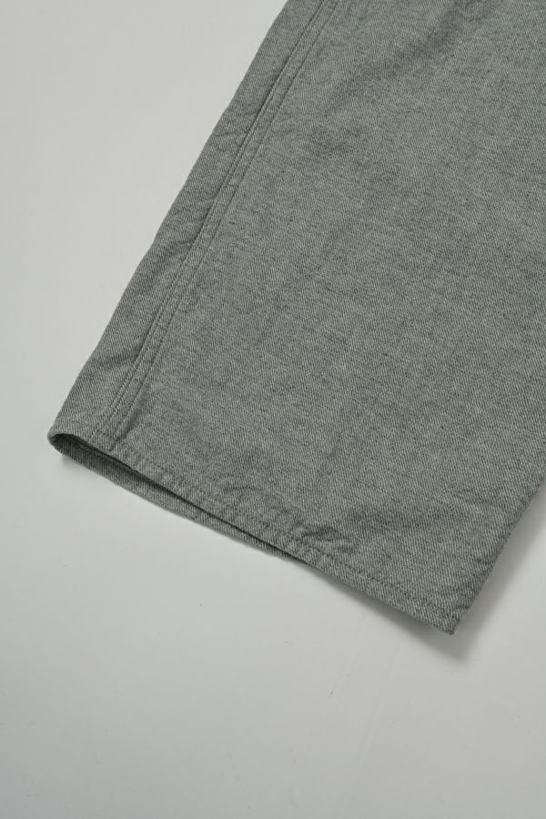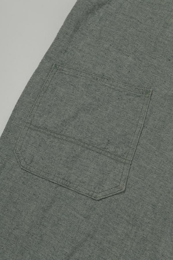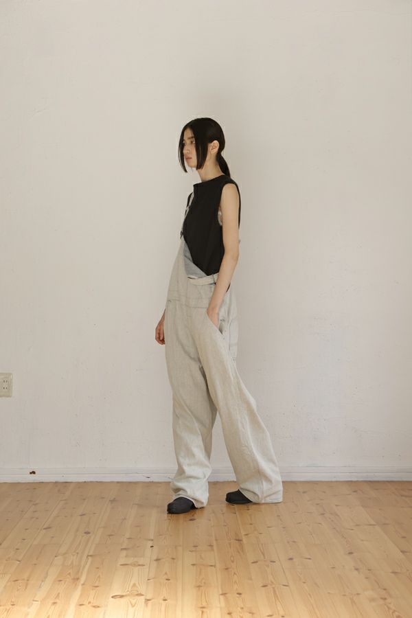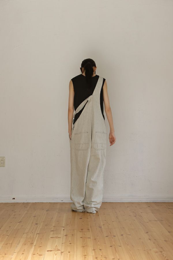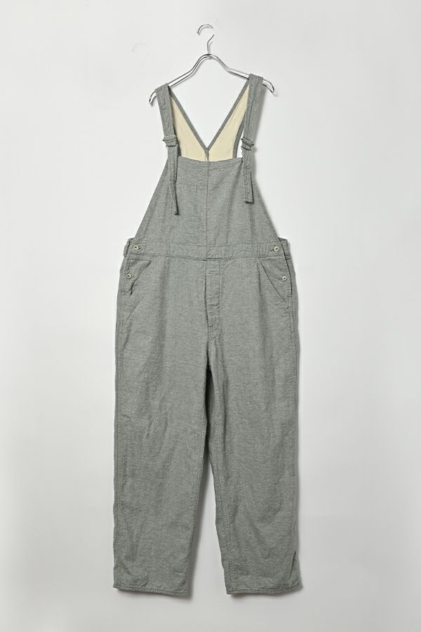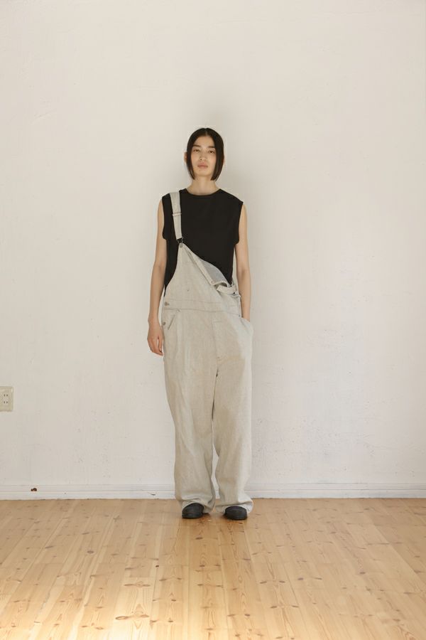 ゆったりとしたシルエットの大人オーバーオール。 生地に特徴があるので、デザインは極力シンプルに。 生地とデザインが上手く融合することで、カジュアルダウンしすぎない抜け感とラフさを表現しています。 ゆるシルエットなので、胸当て布を下ろして着用した際に両脇のベルトループが機能を発揮!ベルトを使えばズレ防止で、安心して着用できます。 前身頃の内側には、胸当てを下ろして着用した際に使用できるポケットのおまけつき。 インナーに厚手のものが着れるサイズ感なので、様々なシーズンで着用可能です。 使用した8.5OZ(オンス)のデニムは、リサイクルデニムを使用。デニムを裁断した時に発生した裁断くずを、綿(わた)に戻し、糸状へ形成。そのリサイクル糸を使用し、新しいデニムを織っています。元々の生地の風合いを残したリサイクル方法なので、インディゴカラーがうっすらと残っていますので、裏柄が薄いブルーになっています。 ホワイトデニムで、裏の糸を変更するのは、昔汚れを目立たせないようにするローテクの機能です。