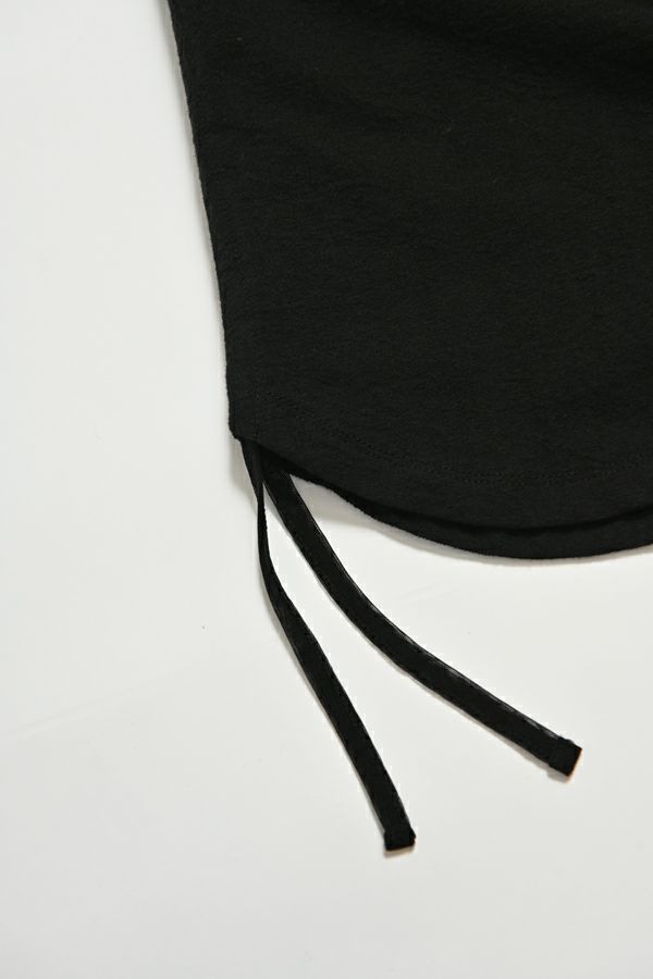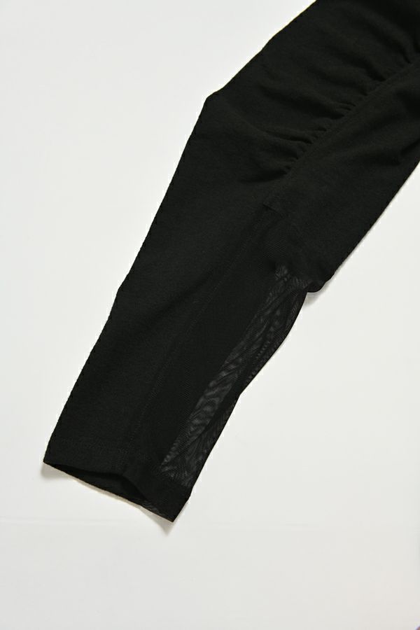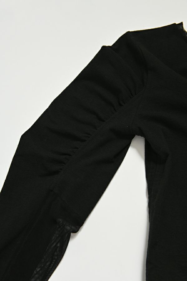 トレンドのパワーショルダーが目を惹くロンTEE。 シャリ感とドライな手触りが特徴的な生地感が新鮮。肩~袖にかけてボリューム感が加わったデザインのパワーショルダーは、存在感抜群。 身頃の両サイドをドローストリングさせ、シャーリングを作ると裾がカーブになり、全体にバランス良く立体感が出ます。 衿と袖下にメッシュ地の切替を入れ、程良いシアー感と華奢見えの要素もプラス。 後ろ姿にも拘りのアクセントを。大人っぽいレタリングで『Destiny』のロゴプリント入り。 存在感のあるデザインでワイドパンツ合わせから、タイトスカートなど幅広い着こなしと好相性です。メンズライクなボトム合わせで、大人のこなれ感あるスタイリングがおススメです。