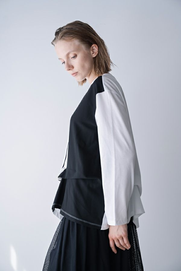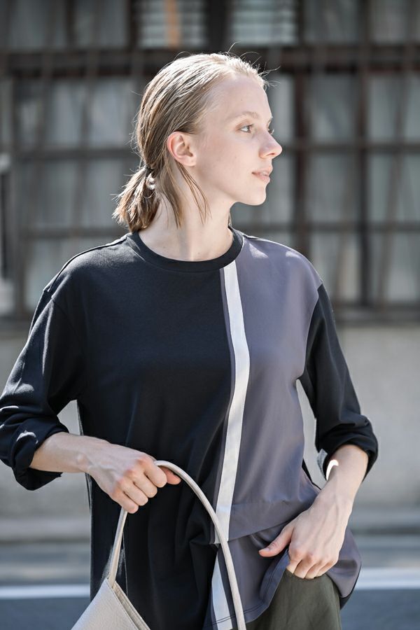 モードな雰囲気漂う、存在感ある大人のロンTEE。 前身頃の配色切替えとテープラインが、細見せに効果的。インパクトのある配色とラインテープがスポーティでありながら、モードを感じるデザインに仕上げています。 ウエストラインのアシンメトリーなタックが裾に動きを付けて、ドレープ感が大人の余裕を醸し出す。 一枚でサマになり、格上げコーデが叶うアイテムです。