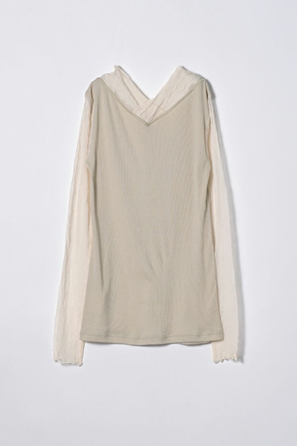 イリブ生地とクラッシュメッシュ切替でのシアー感が今年らしい着こなしに欠かせない日本製 ロンTEE。 素材は特殊なアルビニスタシフォンテレコ素材で、肌触りも良いコットン100%で優しい着心地になっています。今年らしくやや長めのメッシュ袖は、くしゅっと軽くたくし上げて手元のニュアンスを楽しんだり、ブレスレットを合わせるのも素敵です。 着心地の良さとさり気ないシアー感で一枚はもちろん、ニットやジャケットのレイヤードアイテムとしても最適です。 ●日本製 【アルビニスタシフォンテレコ】(イタリア糸) → 細番手の綿をテレコ組織で甘く編み下ろし、肌離れの優れたエアリーなタッチと程良い透け感が新鮮な素材の生地。
