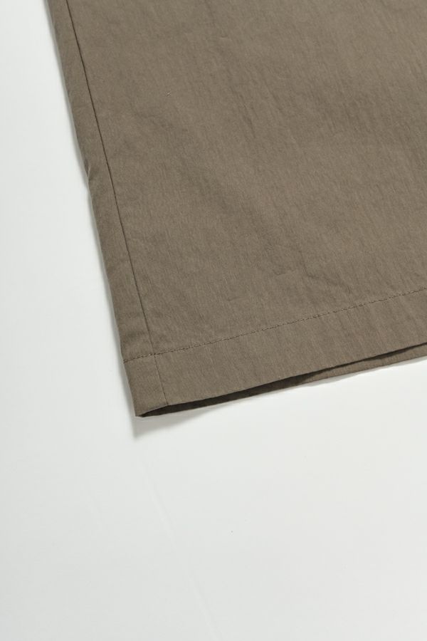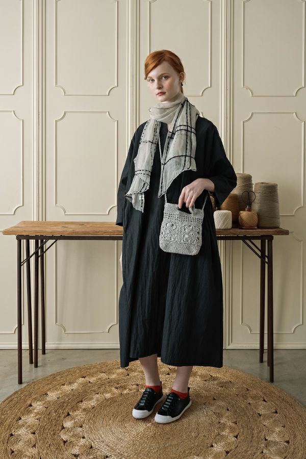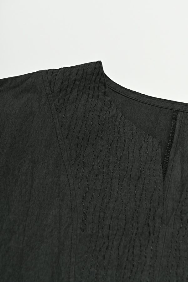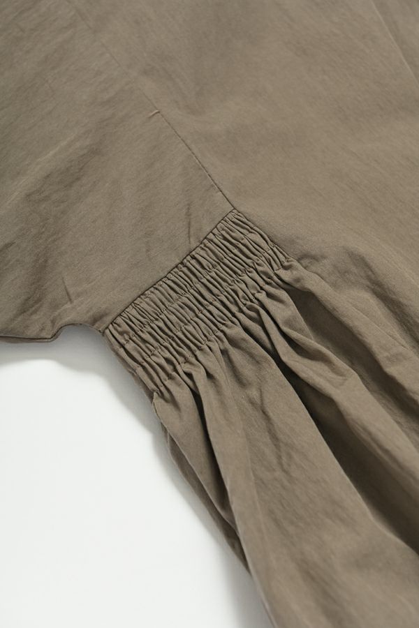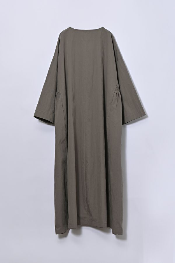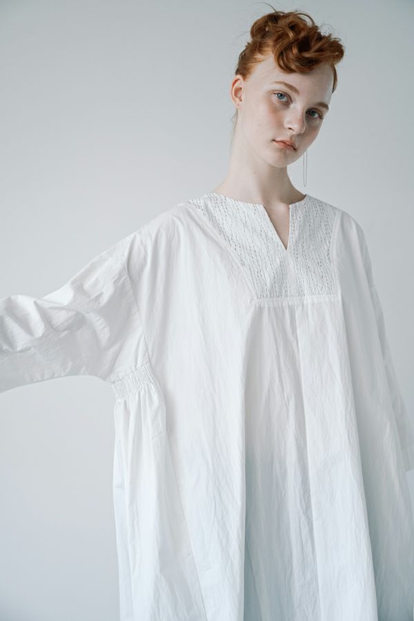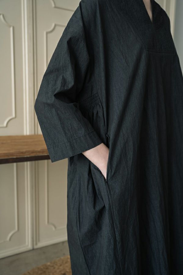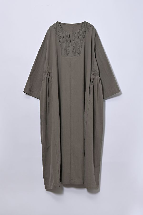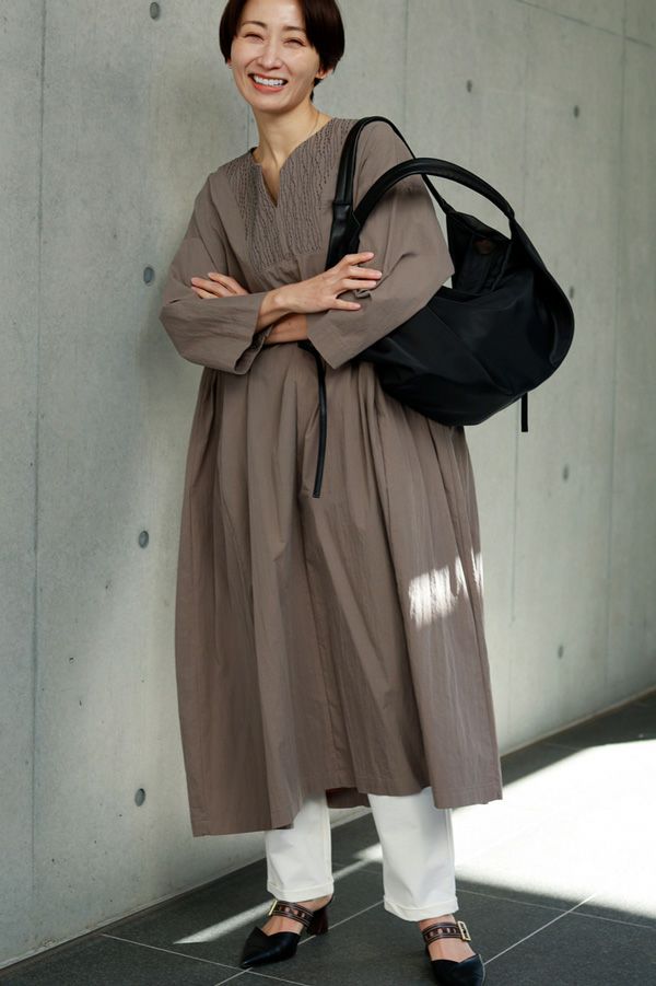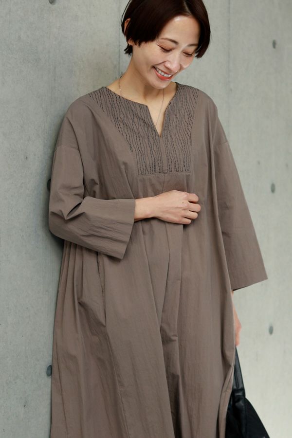 1枚で着映える、大人のナチュラルワンピース。 襟元のすっきりしたスラッシュあきとデコルテ映えの刺繍ステッチが印象的。脇に入ったシャーリング加工がデザインアクセントに。見た目のボリュームに対して 手持ち感が軽く、着心地もラクチンな頼れるアイテムです。 裾が広がらないようにタテの切替えで、拘りの丸みシルエット設計に。 着用すると、立体シルエットが体に馴染み 気になる部分を体型カバーしてくれます。 ハリと光沢感のある綿/ナイロン素材は、製品ウォッシュ加工でナチュラルなシワ感とリラクシーなニュアンスの雰囲気に仕上げています。