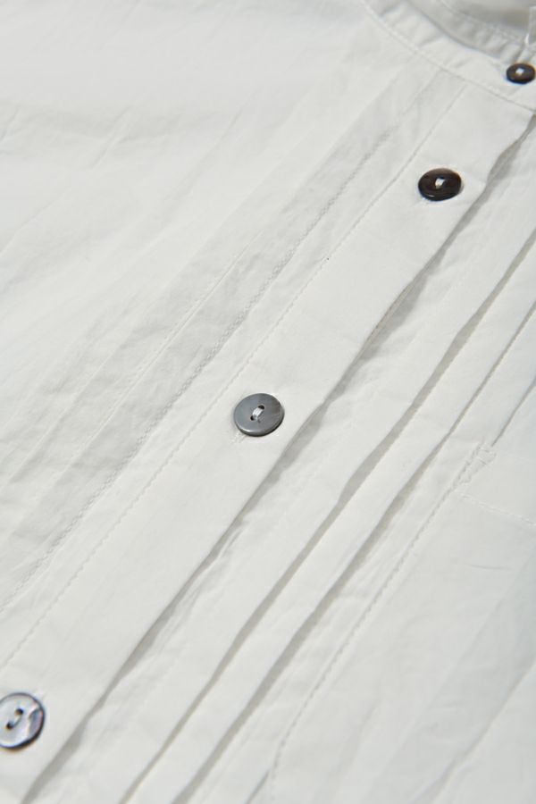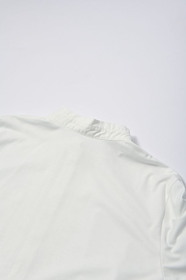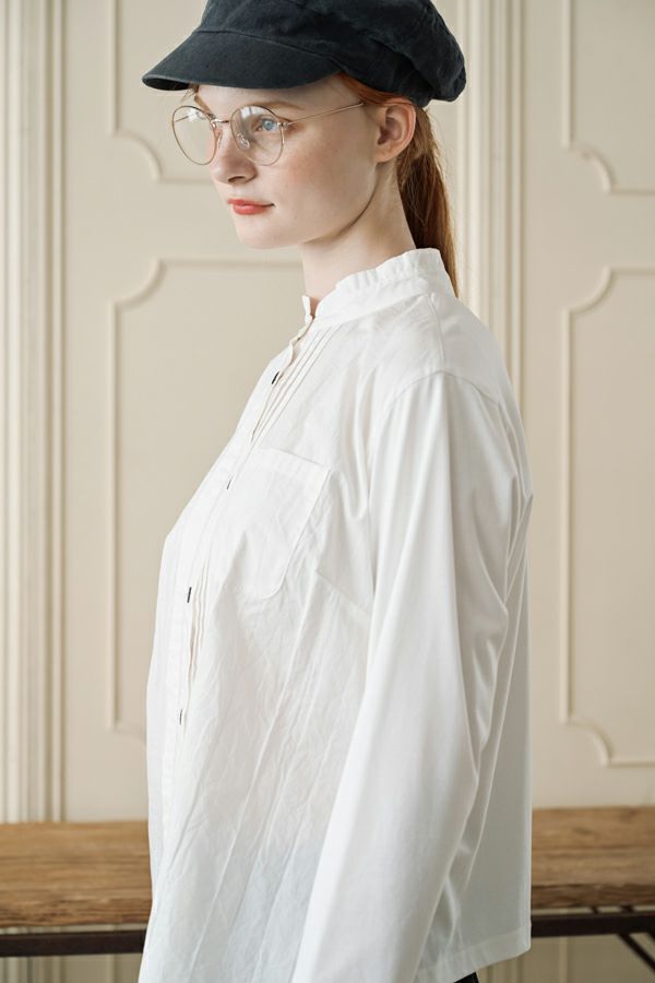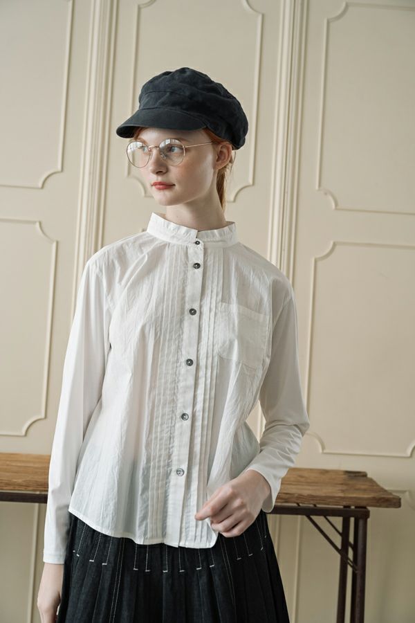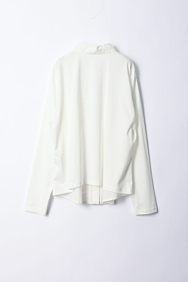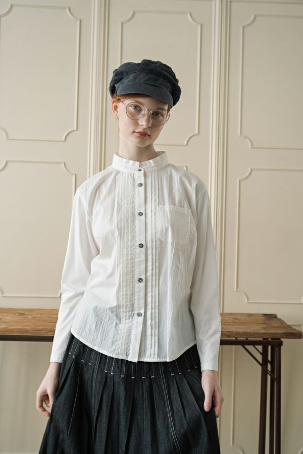 定番バックカットブラウス。前はピンタックの綿生地で後ろと袖はカットソーのインナーシャツ。 細いスタンドカラーは襟元をきちんと見せます。 前は軽くワッシャー加工入り。お腹が隠れる丈でカーブを付けてます。 後ろと袖のカットソーは伸縮性があるので着心地抜群! ①サイズ感はそのままキープ。 ②綿生地は、少しハリ感があり 目が詰まった綺麗めタイプに。 ③カットソー地は、吸湿・速乾の機能性素材を使用。 ④着用時、熱がこもりにくく より快適な着心地にバージョンアップ! ⑤シーズンレス 様々なアイテムのインナーに合わせられるお役立ちアイテムです。