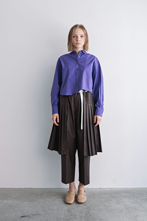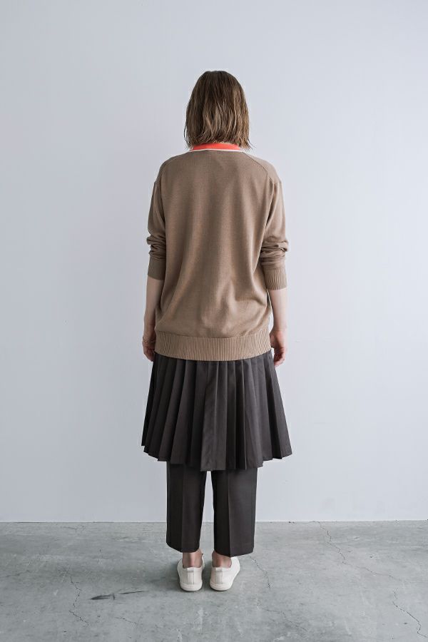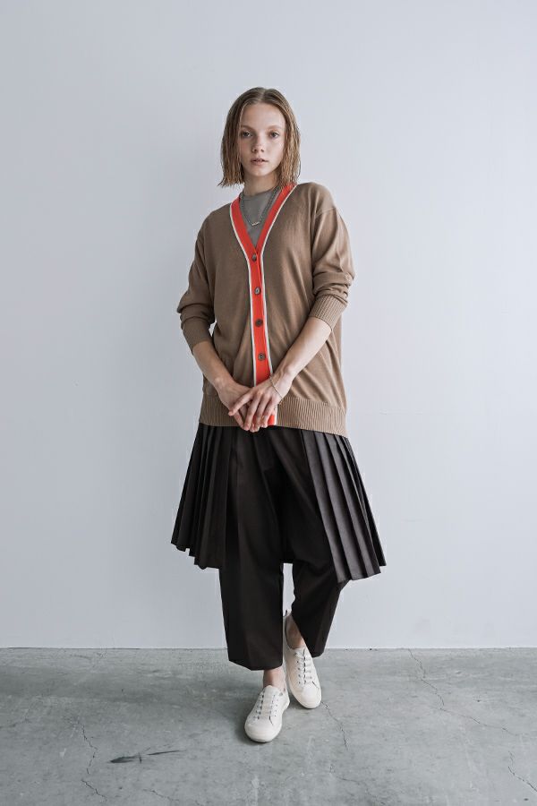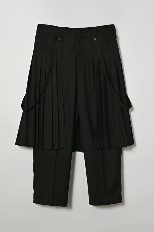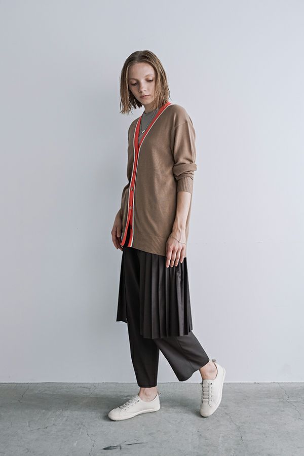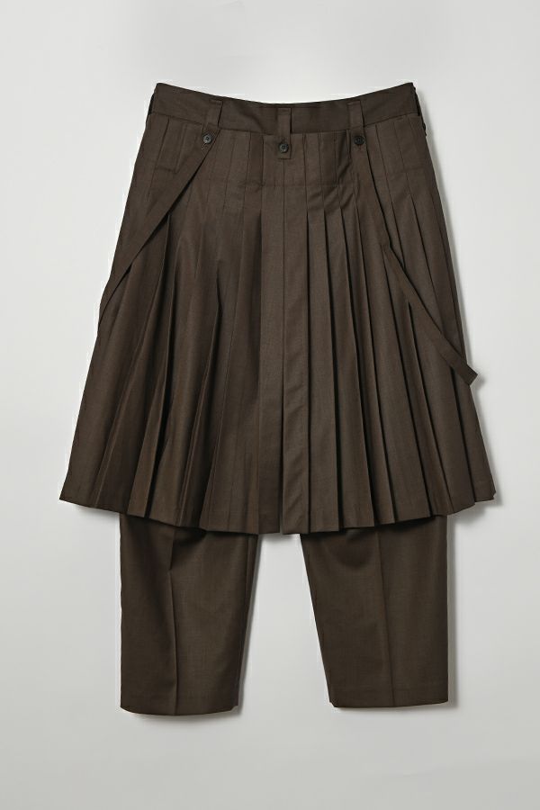 穿いた瞬間、即お洒落。自由なスタイルが楽しめるパンツオンスカート。 何通リにも変化するパンツオンスカートは、ジェンダーレスデザインでありトレンドアイテムです。モード感たっぷりのデザインでありながら、カジュアルなトップとの外しコーデも大人な着こなしに。 シンプルなパンツのラインは、ワンタックのセンタープレス仕様で、ゆとりがあるのに細見えし、マニッシュなスタイリングに◎プリーツスカートを合わせれば、グッとモードな雰囲気になり、同時に体型カバーも叶います。 共生地の細めサスペンダーは、垂らして着用してもこなれ感が出てイイ感じ。 素材は綿/レーヨンの平織に少しだけサマーウールが混じっているので、通気性もよく、シャリ感もあります。 ●プリーツスカート、サスペンダーは取り外し可能。 ●同素材のポケットベスト(25158-5094P-W)とセットアップ可