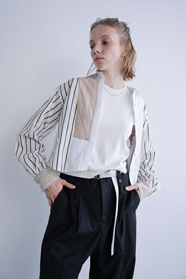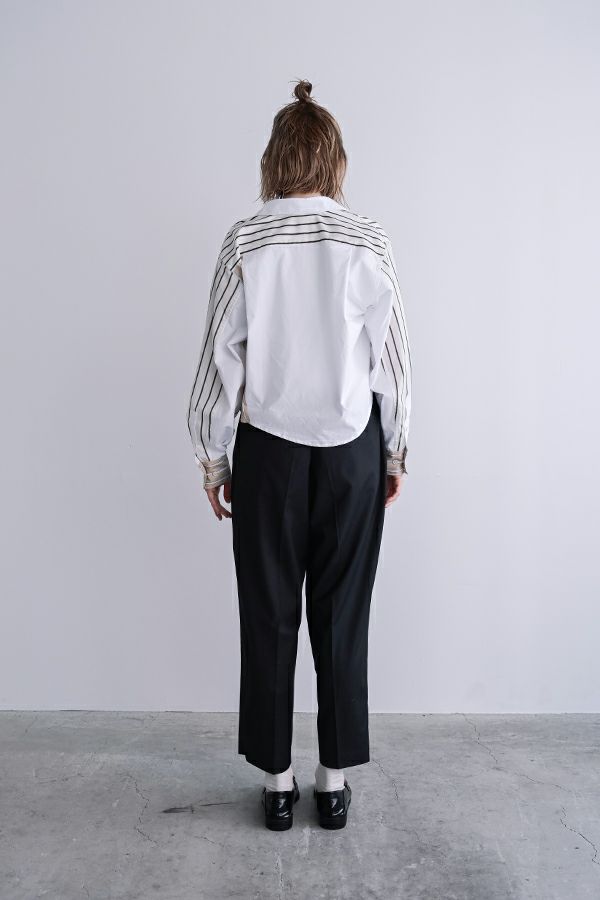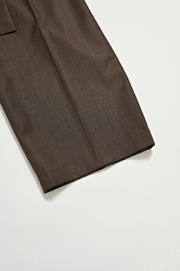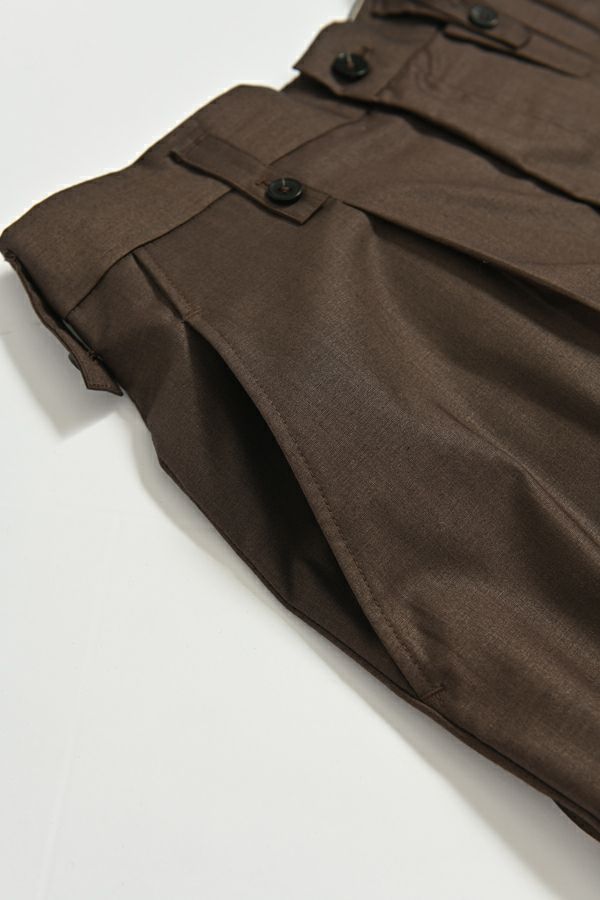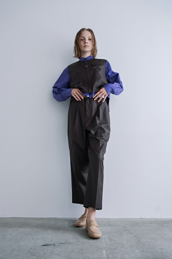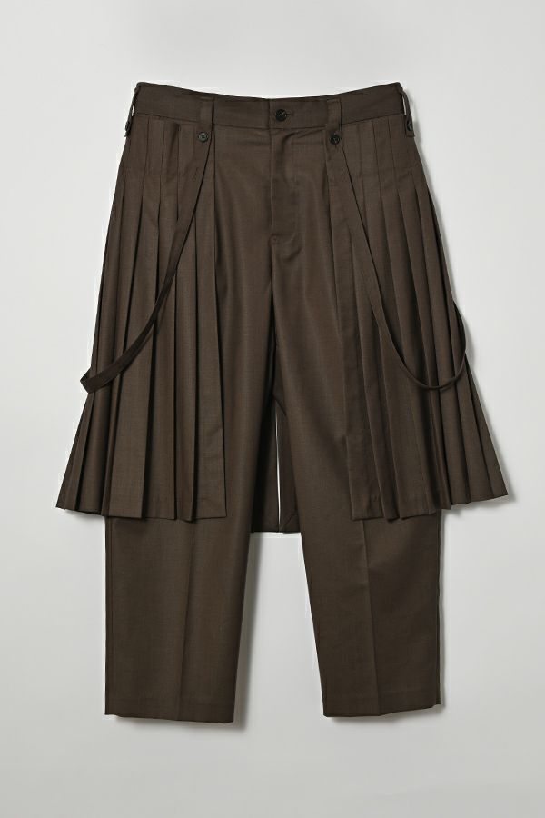 穿いた瞬間、即お洒落。自由なスタイルが楽しめるパンツオンスカート。 何通リにも変化するパンツオンスカートは、ジェンダーレスデザインでありトレンドアイテムです。モード感たっぷりのデザインでありながら、カジュアルなトップとの外しコーデも大人な着こなしに。 シンプルなパンツのラインは、ワンタックのセンタープレス仕様で、ゆとりがあるのに細見えし、マニッシュなスタイリングに◎プリーツスカートを合わせれば、グッとモードな雰囲気になり、同時に体型カバーも叶います。 共生地の細めサスペンダーは、垂らして着用してもこなれ感が出てイイ感じ。 素材は綿/レーヨンの平織に少しだけサマーウールが混じっているので、通気性もよく、シャリ感もあります。 ●プリーツスカート、サスペンダーは取り外し可能。 ●同素材のポケットベスト(25158-5094P-W)とセットアップ可