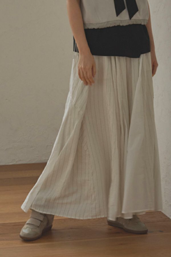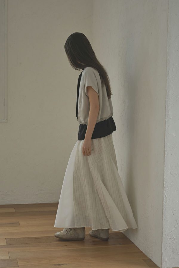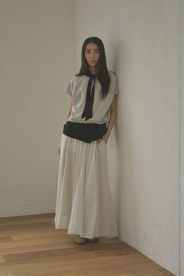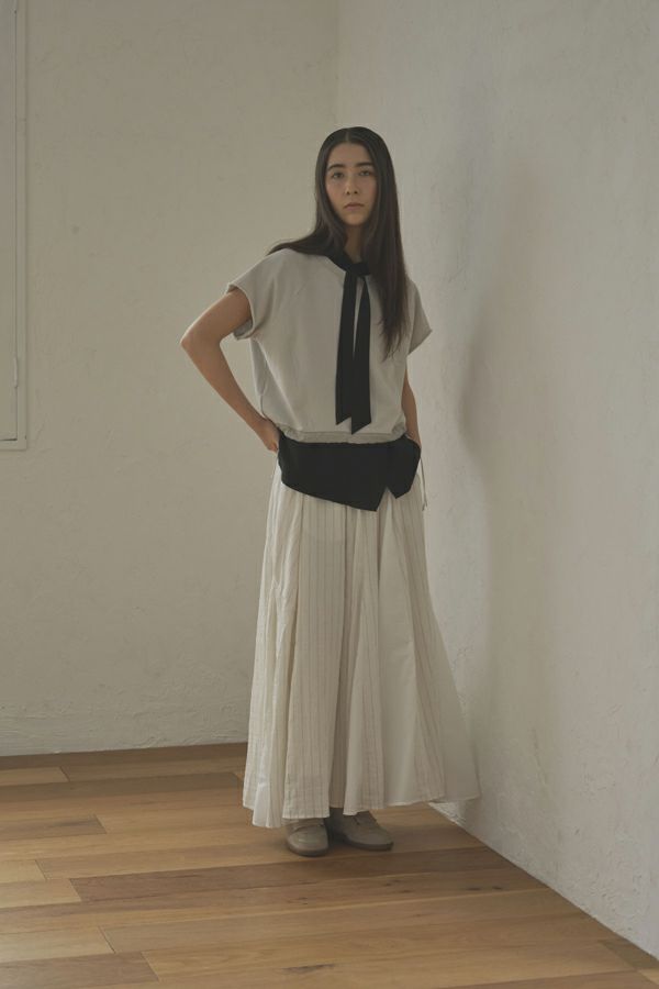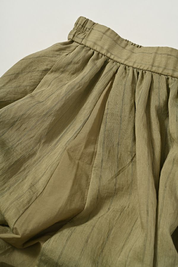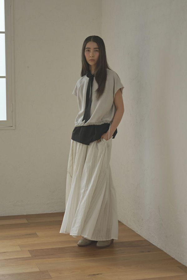 存在感抜群のボリュームで映えで確定、大人の雰囲気溢れるギャザースカート。 昨年に大好評のギャザースカートにストライプバージョンが登場です。 マチの部分は無地の素材を使用し、より表情が出るデザインとなりました。前ウエストはテンション(伸縮性)無しのため スッキリきれい見えし、後ろウエストにはしっかりゴムを入れアジャストも利くように仕上げています。 同素材のストライプポンチョシャツ(25163-4309P)とセットアップ着用でコンビネゾン見えにもなります。セットアップ着用もおすすめですが、Tシャツ合わせのカジュアルスタイルも良いですし、オケージョンスタイルでジャケットコーディネートなどマルチに活用できるスカートです。 ●手洗い可 ●同素材のストライプポンチョシャツ(25163-4309P)とセットアップ可