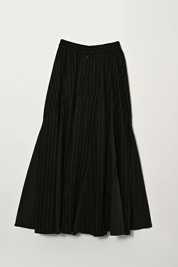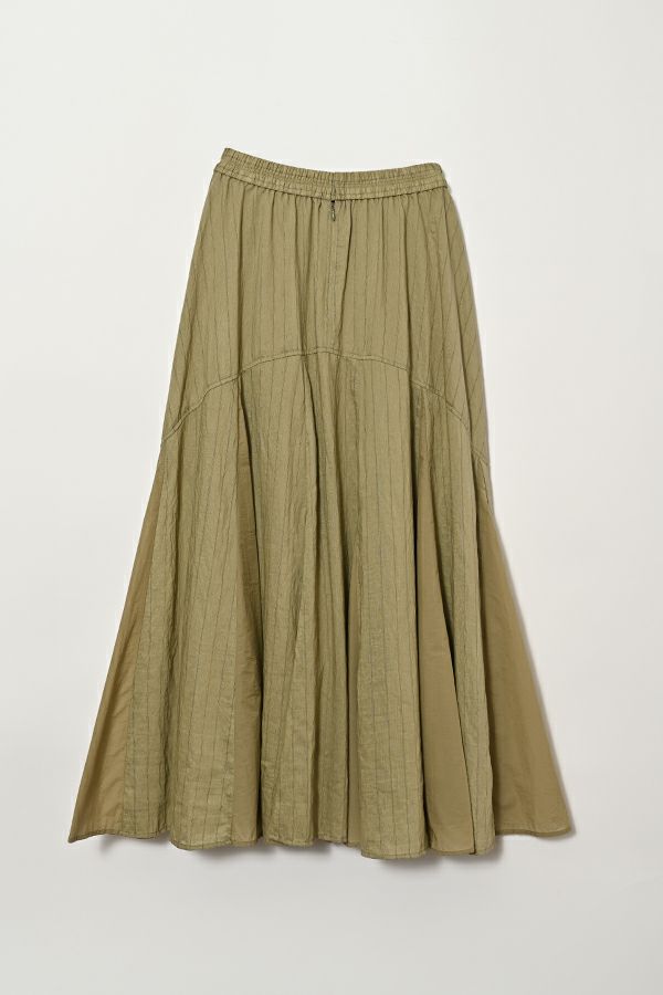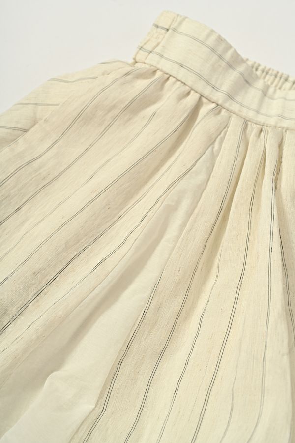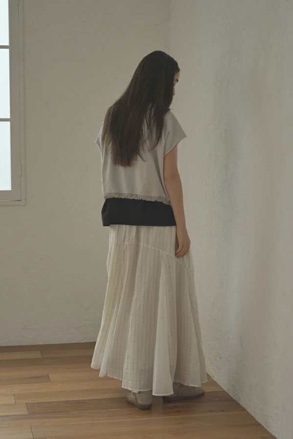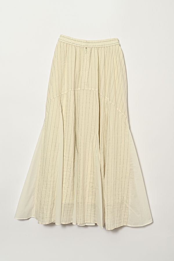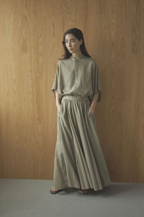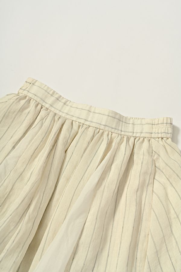 存在感抜群のボリュームで映えで確定、大人の雰囲気溢れるギャザースカート。 昨年に大好評のギャザースカートにストライプバージョンが登場です。 マチの部分は無地の素材を使用し、より表情が出るデザインとなりました。前ウエストはテンション(伸縮性)無しのため スッキリきれい見えし、後ろウエストにはしっかりゴムを入れアジャストも利くように仕上げています。 同素材のストライプポンチョシャツ(25163-4309P)とセットアップ着用でコンビネゾン見えにもなります。セットアップ着用もおすすめですが、Tシャツ合わせのカジュアルスタイルも良いですし、オケージョンスタイルでジャケットコーディネートなどマルチに活用できるスカートです。 ●手洗い可 ●同素材のストライプポンチョシャツ(25163-4309P)とセットアップ可