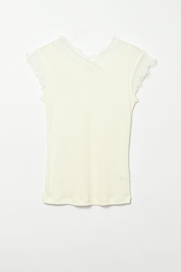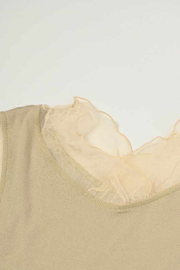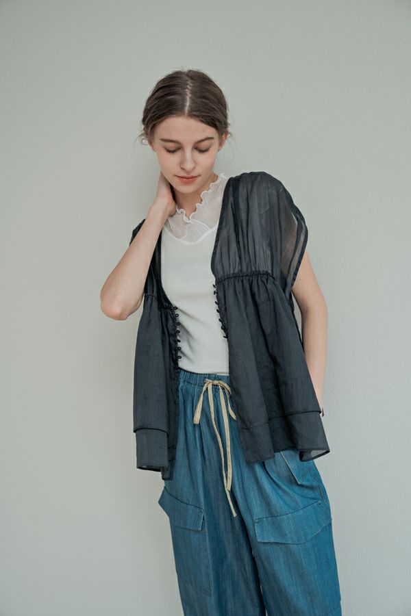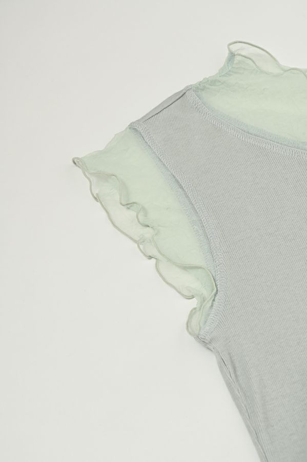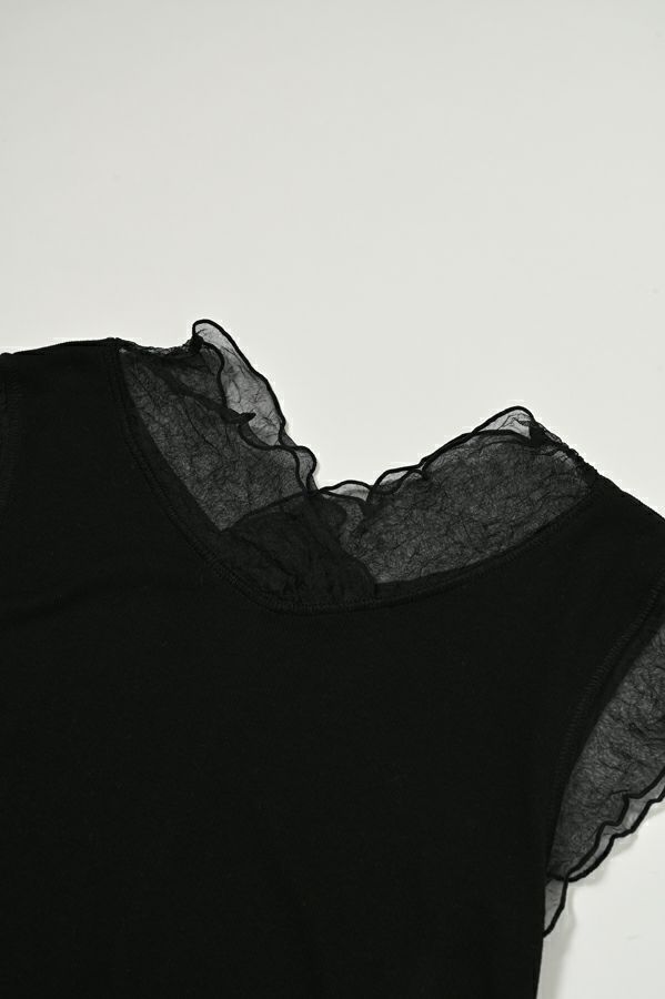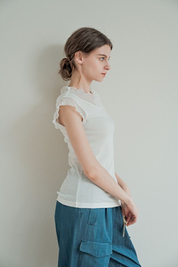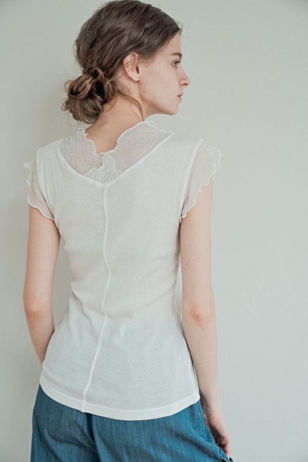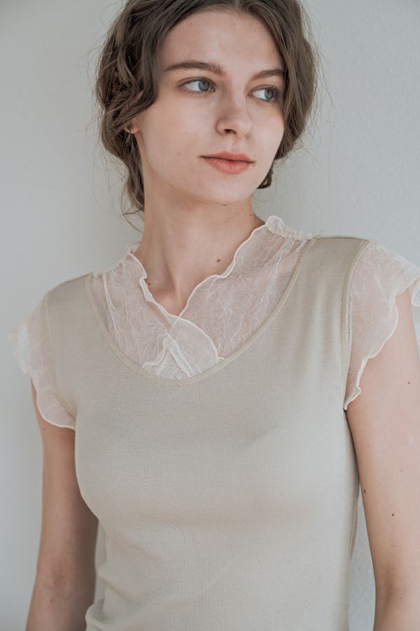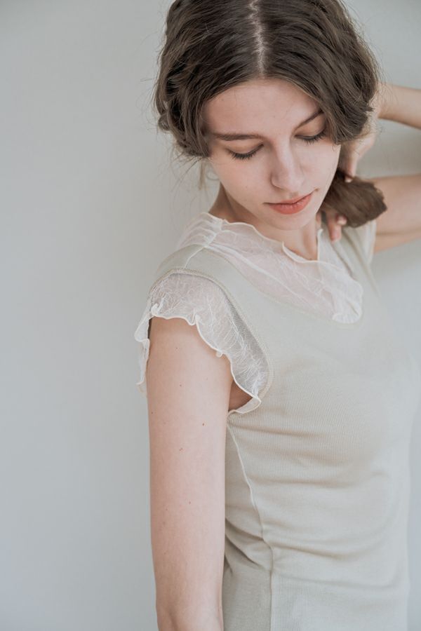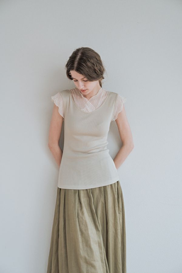 レイヤードスタイルに欠かせない、フレンチスリーブタンク。 リブ生地とクラッシュメッシュを組合わせ、洗練された印象のアイテム。 24年秋シリーズで登場したメッシュネックプルオーバー(24228-1614Z-G)が大好評。今回は人気商品の夏バージョンです。 素材は特殊なアルビニスタシフォンテレコ素材で、肌触りも良いコットン100%で優しい着心地になっています。首元が大きく開いたトップスなどのインナーに使えます。軽やかなクラッシュレースを首元から覗かせて可愛い衿廻りにアレンジ可能。 着心地の良さとさり気ないシアー感で一枚はもちろん、ジャンパースカートやキャミワンピースのインナー合わせにもおススメです。華奢な雰囲気でレイヤードアイテムとして重宝します。 ●日本製 ●【アルビニスタシフォンテレコ】(イタリア糸) → 細番手の綿をテレコ組織で甘く編み下ろし、肌離れの優れたエアリーなタッチと程良い透け感が新鮮な素材の生地。
