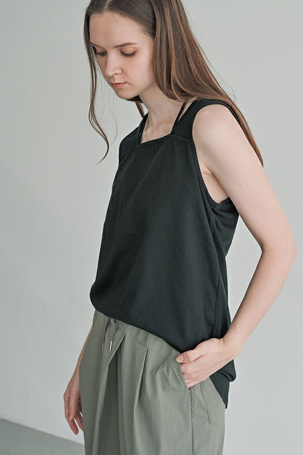 女性らしさが際立つ、定番の紐タンクトップ。 華奢な衿元が特徴のタンクトップ。前後差のついた裾が、お腹周りやヒップを美しくカバーし、スタイルアップ効果も抜群。衿開きの広いトップスの下に重ねると、チラリと見える肩紐が女性らしい印象を惹き立てます。 シンプルでありながら、シーズン問わず活躍するデザインなので、ヘビロテ間違いなしの一着です。 ●日本製