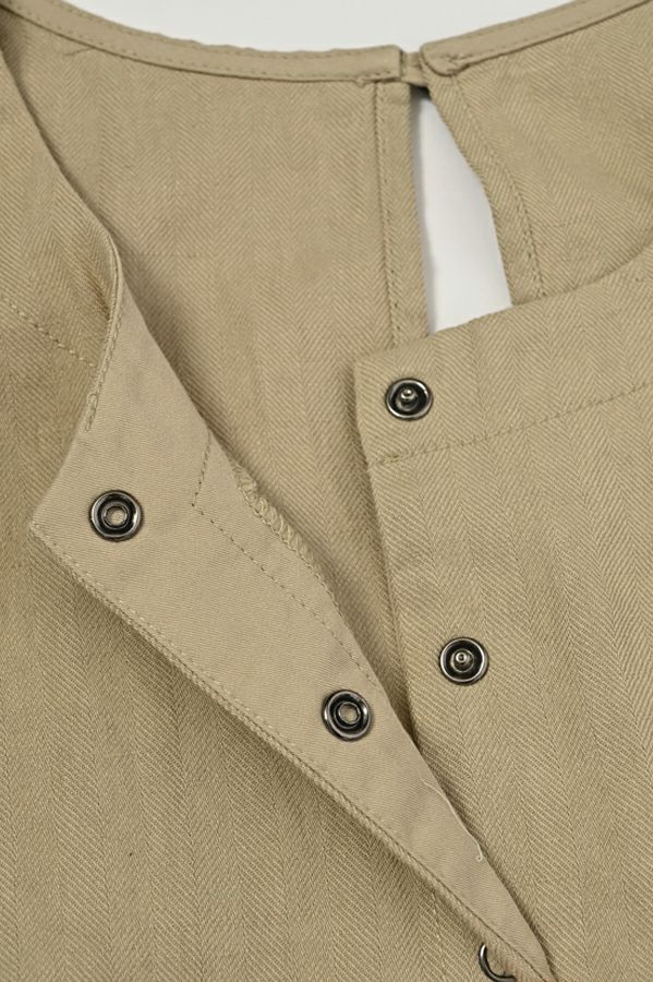 リラクシーカジュアルにピッタリな、抜け感大人コンビネゾン。 ヘリンボン地の綿/麻にレーヨン系素材の入った滑らかな質感。柔らかな肌触りが合わさり着心地良く、カジュアルだけどakaneらしさのある大人っぽいアイテムです。 ゆとりのある身幅に大きなカーブをつけた袖ぐりが特徴で、下に着るものと羽織りものを選ばず、脇ゴムと前後のベルトバックルでサイズ対応出来ます。背中に入れた長めスリットは背中をスッキリ綺麗に見せ、後ろウエストのゴムギャザーはヒップ周りをカバーし腰高に見せ、大人が着映える仕掛けに。 インナーに合わせたタンクトップと透け感のある羽織りでライトなカジュアルスタイルを提案。