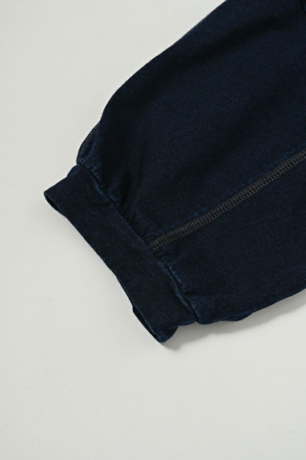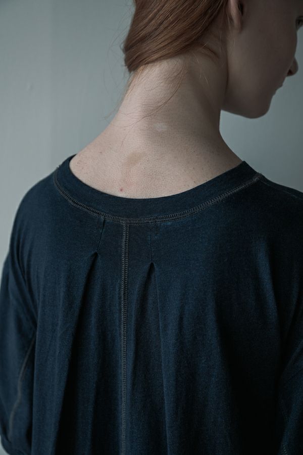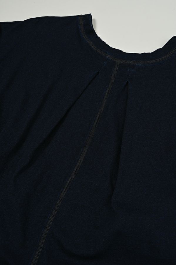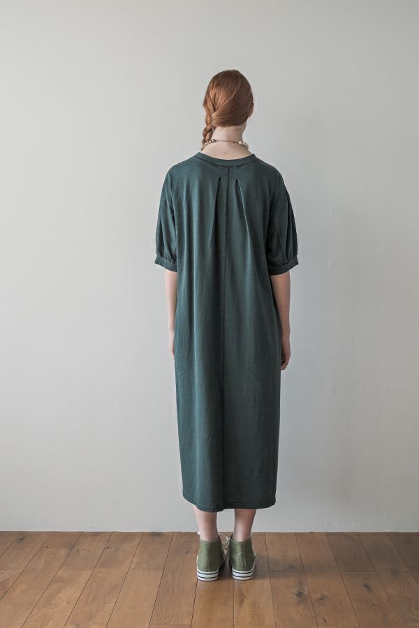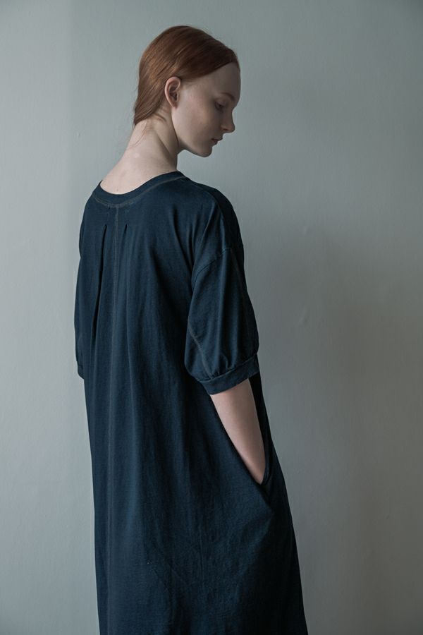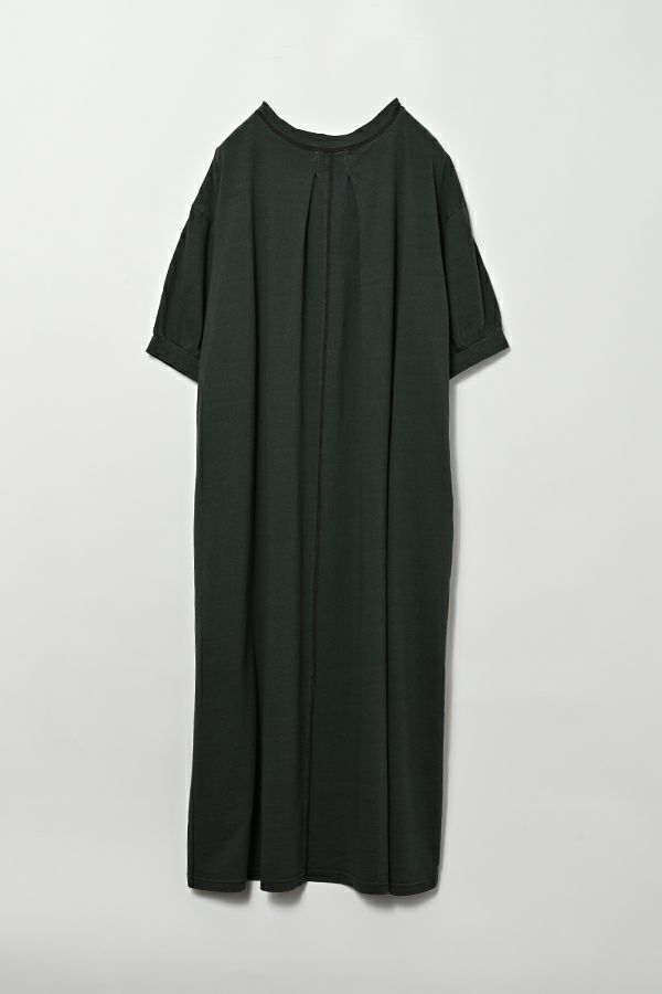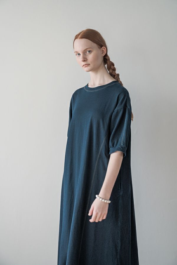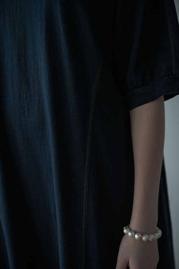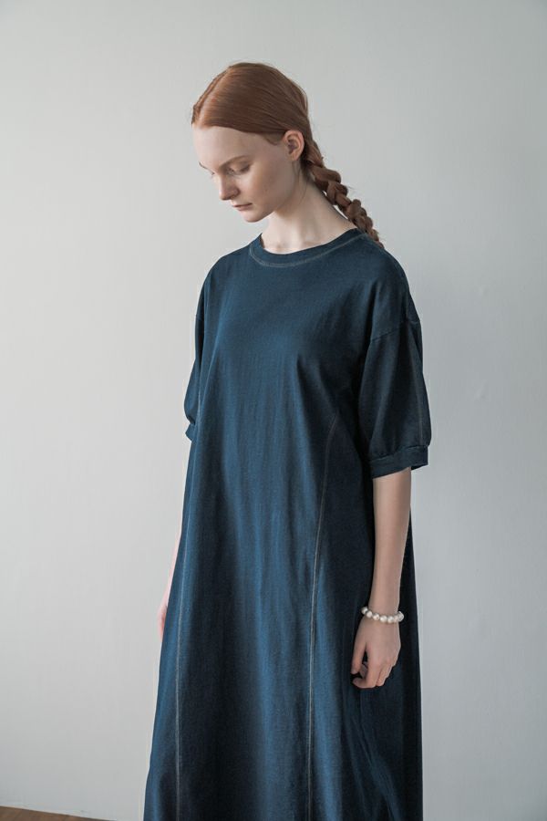 夏の即戦力。ストンと着てサマになる、デザインワンピース。 縦に入った配色飾りステッチと丸く膨らませた袖がキュート。デニムカットソー生地のセミAラインシルエットは、楽ちんなのにお洒落な1枚。安心の袖丈も嬉しいポイント。背中に入った斜めタックは、気になる背中の丸みをカバーしてくれます。 製品洗いで柔らかく仕上げ、カットソーならではのストレッチ性で着心地も良く、1枚着はもちろん、コーディネート次第でロングシーズン着用可能です。 サンダルでもスニーカーでもソックスを履いても似合うワンピースは即戦力、間違いなし。 ●色落ちしますので、他の物と一緒に洗わないで下さい。ご愛用とともに、独特の色落ちの変化をお楽しみください。