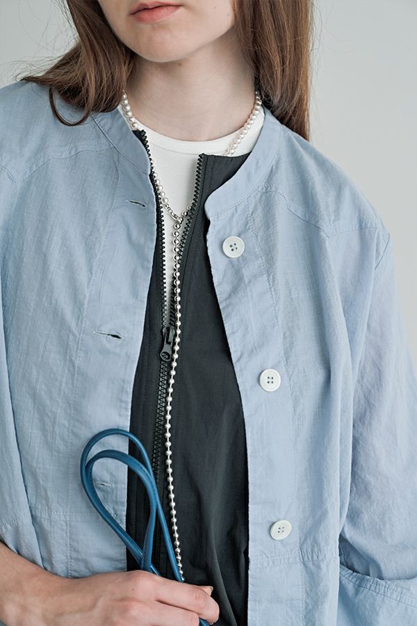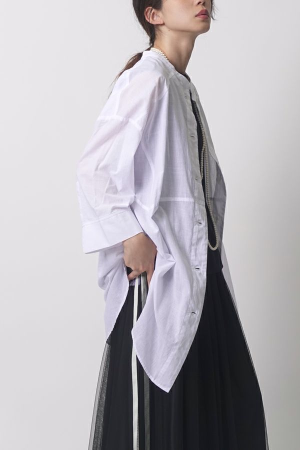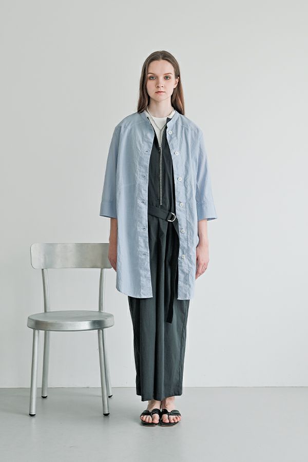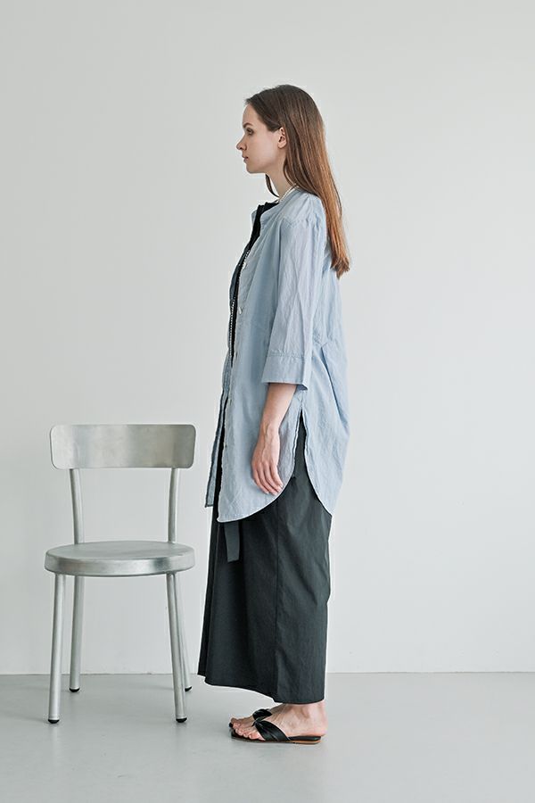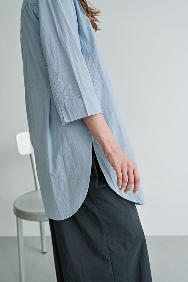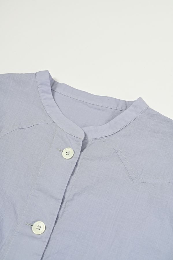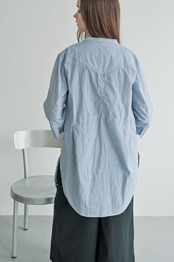 ハンサムを楽しむ、大人のウェスタンブラウス。 程よいシアー感と軽やかな綿素材が、夏の素肌にも心地よく、洗いざらしのワッシャー感も気にならないので、旅行や、室内の冷房対策にも丁度いい。 空気を纏うような軽さで、サッと羽織るだけでサマになり、色々なスタイルに合わせることができる優秀アイテム。 心地よいオーバーサイズ設定で、ウェスタンヨーク切替えがアクセントに。サイドは深めのカーブスリットなので、脚長効果も期待。少し大きめのボタンが絶妙なバランス感を醸し出す。