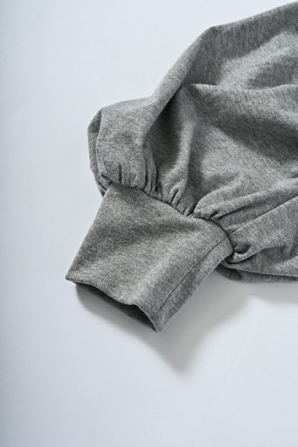 大人気! 1枚でも重ね着しても決まる、ギャザースリーブプルオーバー。 今シーズンは袖のギャザー分量を減らし袖丈を少し短くすることで、より着やすくデザインをブラッシュアップ。 ボリューム袖が際立つよう、身頃はあえてシンプルに。袖のシャーリングは、前寄りに入れることで立体的な印象を与え、肘にも当たらず快適な着心地を確保。 シンプルにデニムと合わせるだけで いつものコーデを格上げ。キャミワンピースやジレなどにレイヤードさせ「魅せるインナー」スタイリングでエッジを効かせるのも魅力的。裾がラウンドになっているのでフロントをウエストインするスタイリングもバランス◎ ●日本製