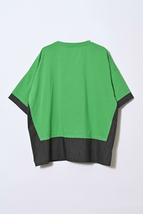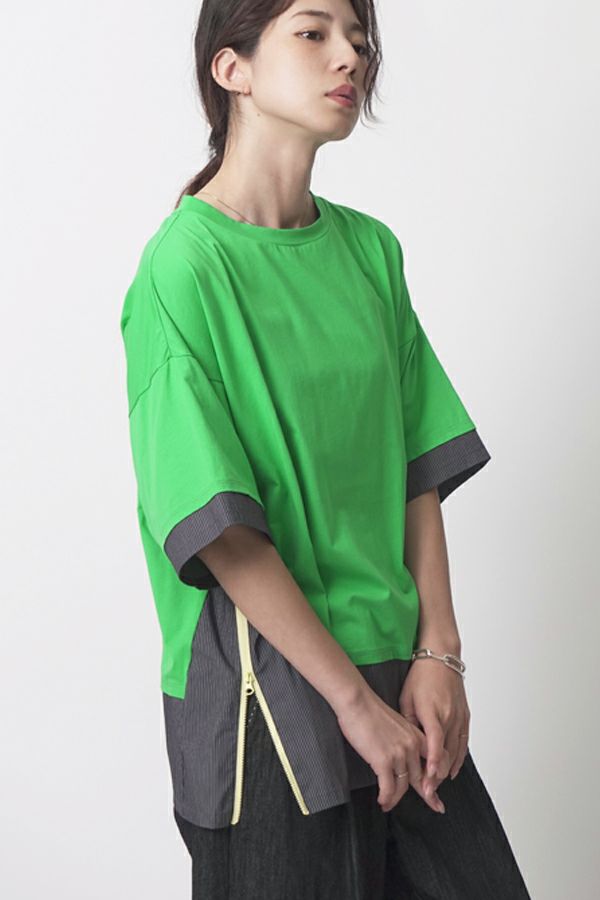 軽やかでありながら、洗練された存在感を放つプルオーバー。肌触りの良さと程よいハリ感を兼ね備えた綿100%カットソー素材に、上品なシャツストライプの布帛を巧みに組み合わせたデザイン。脇の切り替え部分は、細見え効果を引き出し、スタイルアップ効果も期待。さらに、脇のファスナーにカラーを施し、デザインのアクセントに。少し開けることで、自然にゆとりのあるボックス&フレアシルエットが生まれ、清涼感と大人の遊び心を引き立てます。シンプルながらも、どこか遊び心のあるデザインは、あなたのスタイルに一層の魅力をプラス。これ一枚で、カジュアルでありながら洗練された大人の雰囲気を楽しめます。シンプルだけど、ひと味違う。あなたのスタイルに新たなアクセントを。●手洗い可