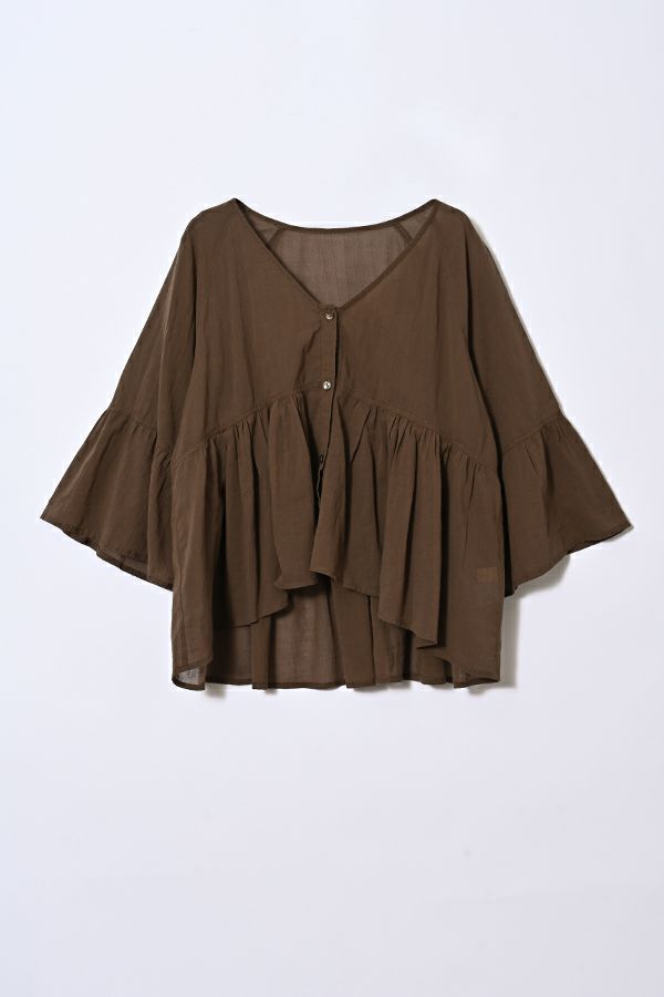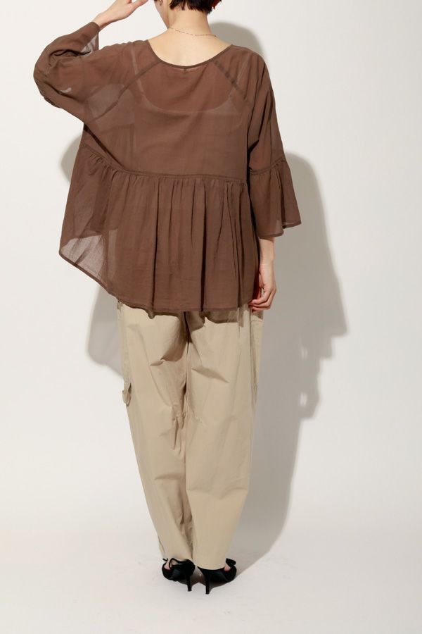 ゆるっと着心地抜群、旬顔コットンボレロ。夏の暑さに対応した大人気の綿強燃素材から、ギャザーたっぷりのティアードボレロブラウスを展開。 シフォンのように透け感のある柔らかい質感で、さらっとしていて涼しく落ち感もあり着心地抜群です。ふんわりシルエットが大人可愛い。 ギャザーがたっぷりと施された袖口と、バストライン下の切り替えが優美な雰囲気を演出。エレガントなフェミニンスタイルに仕上げます。ラグラン袖でゆったりとしたシルエットなので、インナーを選ばず重ね着しやすい一着。夏の羽織りとして重宝します。●同素材のティアードワンピース(25178-2324B-R)とセットアップ可●手洗い可