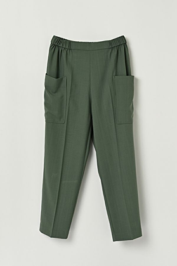 穿くだけで即美脚、涼しさと快適さを兼ね備えた極上パンツ。 縦ストレッチが効いた軽やかで涼しいジョーゼット素材のスティックパンツ。 シワになりにくく、快適な穿き心地が魅力です。 両サイドのパッチポケットがヒップ周りをカバーし、美しいシルエットを保ちながらも、楽な着心地を実現。前中心にギャザーを入れずスッキリと仕上げ、センタープレスで脚長効果も抜群です。きれいめな仕上がりながら、脇から後ろ部分はゴム仕様で、長時間の着用でも快適。 トップスを選ばず、着回し力抜群の一枚です。 この夏、あなたの新定番パンツになる予感。