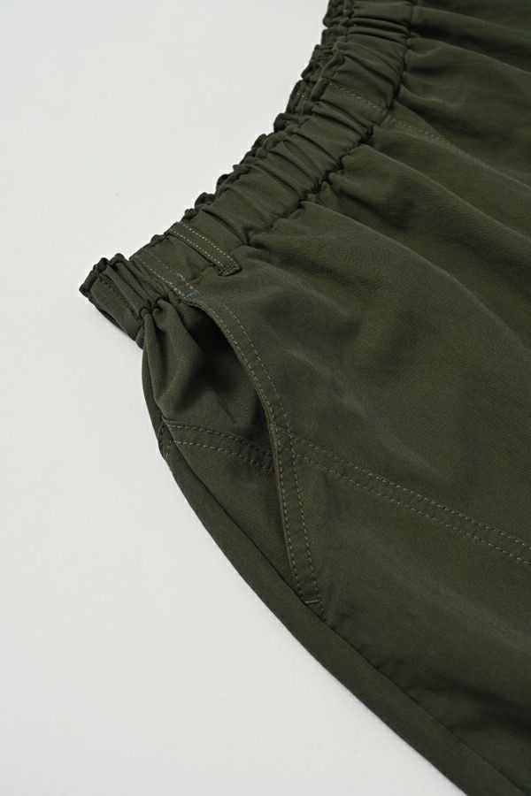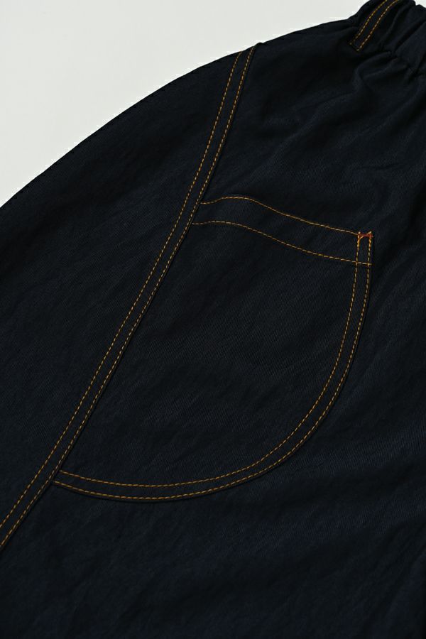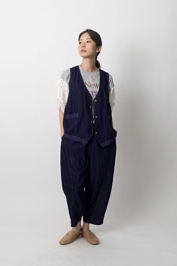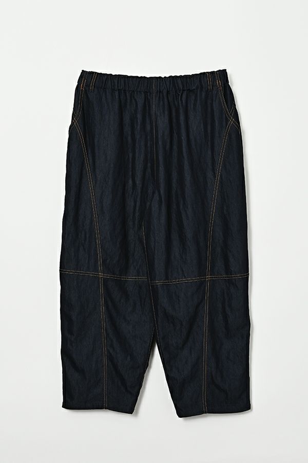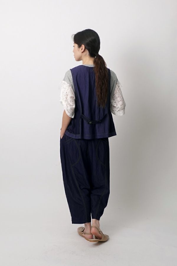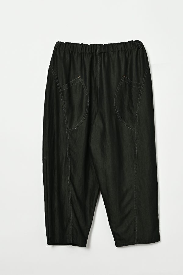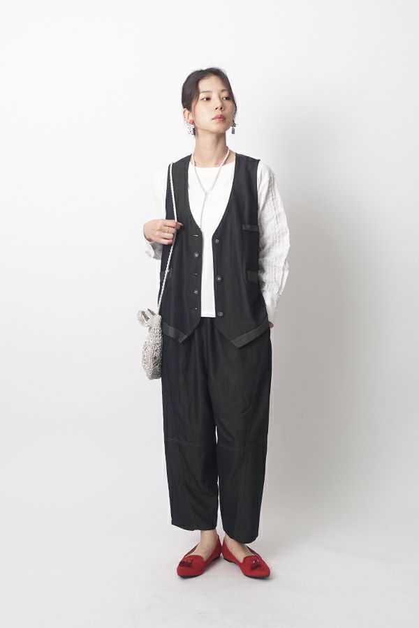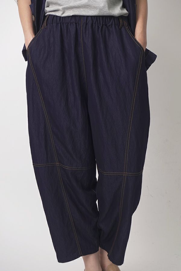 軽やかに、品よく。大人の余裕を纏うコクーンパンツ。 落ち感のあるツイル(綾)素材は、シャンブレーならではの軽やかさとほのかな艶感で、大人のカジュアルシックな佇まいを演出。 akane定番のコクーンパンツは、ゆったりとしたリラクシーなサイズ感ながら、前後に入れた縦切り替えと前のバイヤスカットが、すっきりとした印象に。裾は程よく細めに仕上げ、わたり幅にゆとりを持たせることで膝が出にくく、美しいシルエットをキープ。さらに、後ろのパッチポケットは中心に寄せて配置し、小尻見えも叶える技ありデザインです。 シンプルなトップスに合わせるだけで、ナチュラルモードな着こなしが完成する一本です。 ●配色切ベスト[クールポケット付き](25218-5681B-R)とセットアップ可