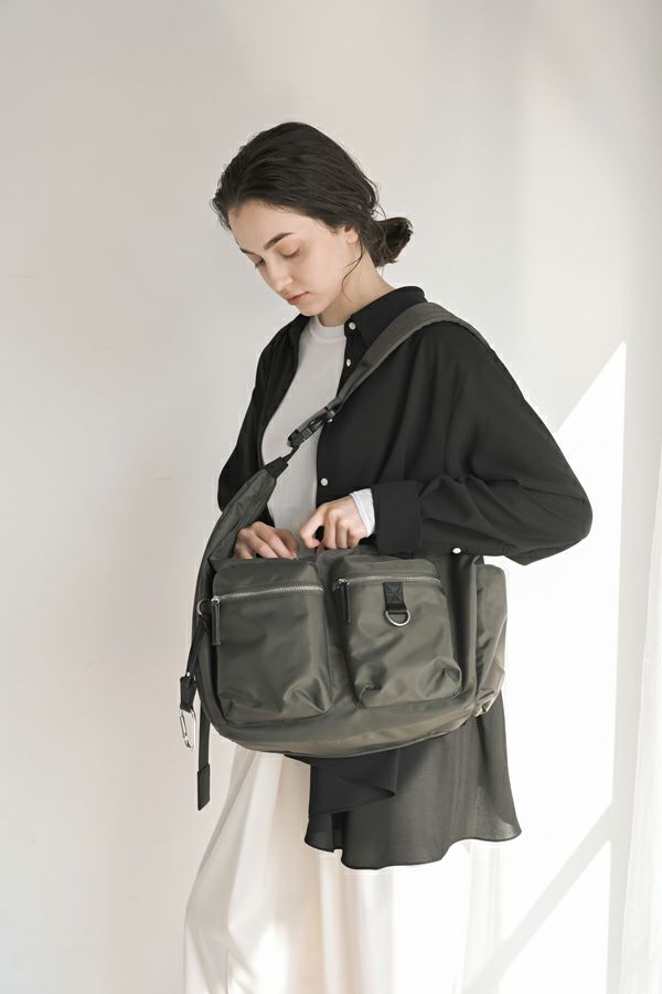大容量・スタイリッシュ・機能性も抜かりなし、毎日使いたいショルダーBAG。 ユニセックスなデザインなのでご家族での兼用もおすすめです。 通勤、お出掛け、レジャーに、、 荷物が多い日でも安心の収納力が魅力の優秀アイテム。 フロントのポケットがエッジの効いたアクセントに。ショルダーベルトはあえて長めに垂らすことで「イマドキ」感を演出。ベルトの先にはロゴをあしらっています。 フロントのDカンやカナビラには、キーホルダーを付けたりオリジナルのカスタマイズが楽しめます。