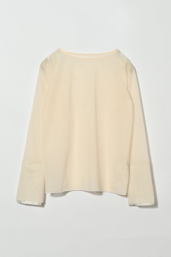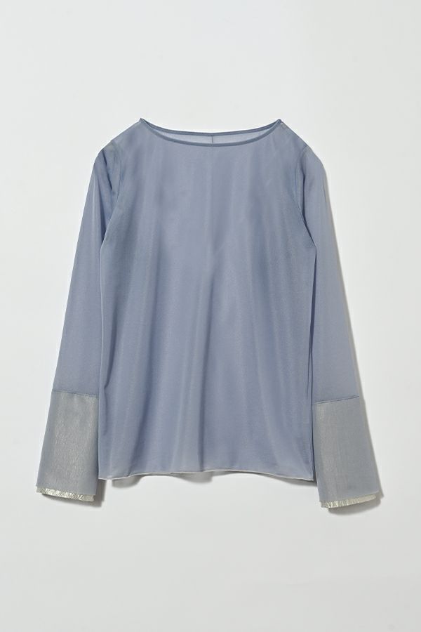 ブライトな異素材使いが映える、上品な大人ロンTEE。 トレンドのシアー感を取り入れ、糸や織りで独特なシボ感を表現した繊細なニットオーガンジーを使用しています。 袖口には光沢感のあるカールマイヤー(ドイツ製のタテ編み機)素材を重ね、上品さと高級感をプラスしています。後ろ中心と裾には配色のメロウ始末をあしらい、さりげないアクセントに。 キャミソールやタンクトップの上に重ねて、デニムでカジュアルに着こなすのはもちろん、秋の立ち上がり時期には、軽やかなワンピースのインナーとしても大活躍。まだ暑さの残る季節の変わり目にもぴったりな、万能レイヤードアイテム。 ●日本製