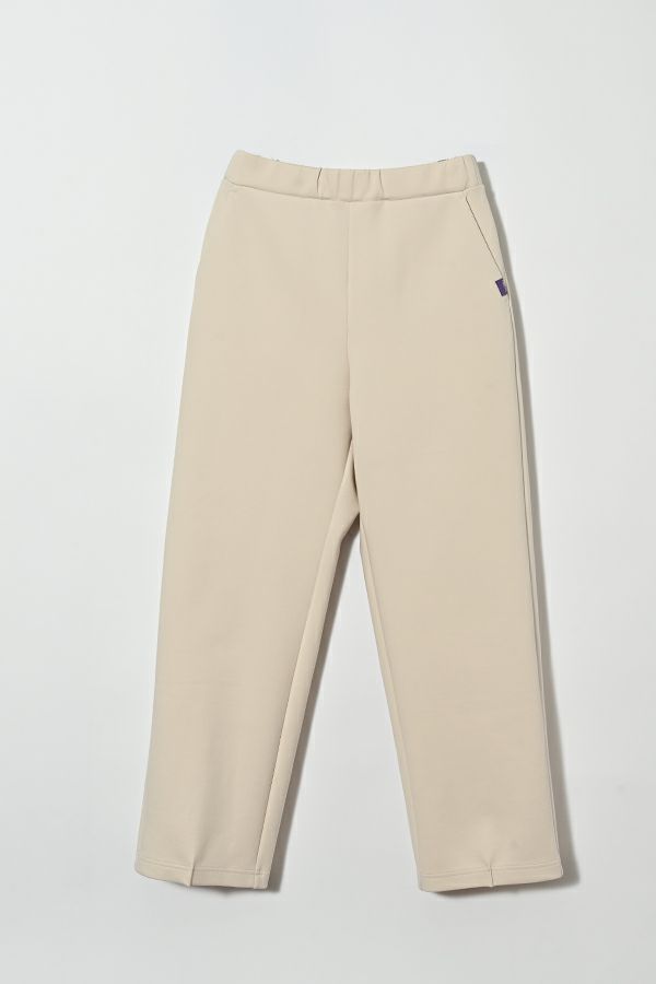 穿きやすさと上品な佇まいを兼ね備えた、大人のためのスウェットトラウザー。 スウェット特有のリラックス感を活かしつつ、トラウザーのパターンで仕立てることで、立ち姿まで美しく見えるシルエットに仕上げました。裾の一部をつまむことで、センターたたみが綺麗に出るよう工夫されており、ラフな素材でありながらも凛とした印象を与える一本です。 生地には、適度なハリと伸縮性を備えたダンボール素材を使用。綿/ポリエステルで、ナチュラルな風合いを残しながらもきれいな目面に仕上がり、日常から少しきちんとしたシーンまで幅広く活躍してくれます。 ダンボール素材ならではのふくらみ感と軽さに加え、ほんのりとした保温性もあり、秋冬にも快適に着用できる素材感です。