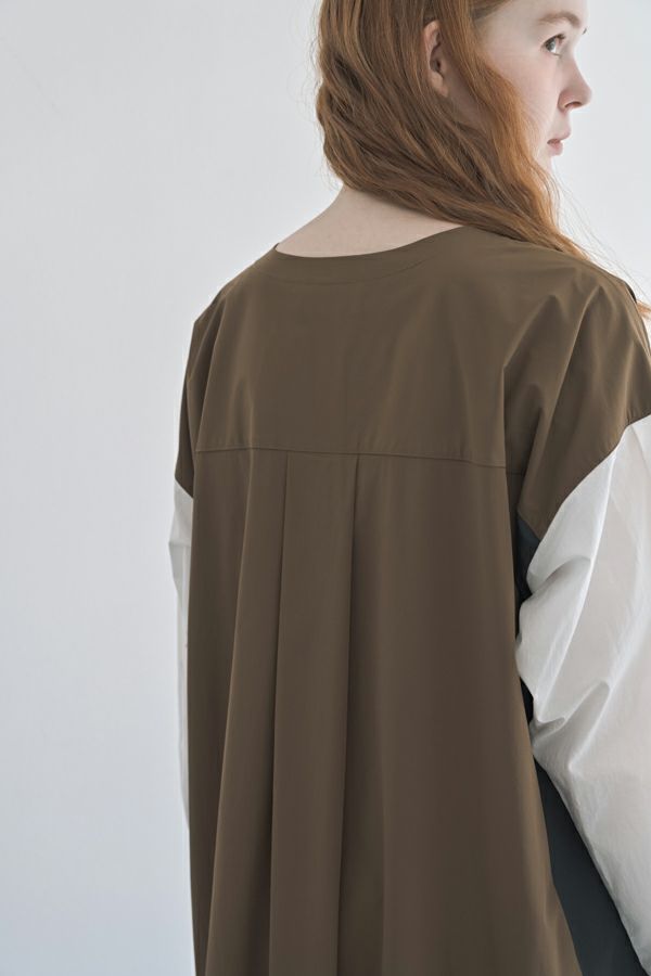 ストンと着るだけで決まる、ボックスシルエットのVネック風ワンピース。 軽くて柔らかく、ストレッチ性のあるナイロン素材を使用。軽やかなのに立体的なシルエットが叶う一枚です。 マチの入ったボタンアクセントが胸元をすっきり見せ、女性らしい印象を演出。白いシャツ袖が上品で高級感をプラスしつつ、脇の配色切り替えやフロントのボタンデザインが程よくカジュアルな雰囲気を加え、バランスの取れた仕上がりに。 素材には適度なハリ感があり、シワになりにくいのも嬉しいポイント。着こなしのアレンジも自由自在。カジュアルに楽しむなら、スニーカーやサイドゴアブーツと合わせて◎アクセサリーをプラスすれば、オケージョンシーンにも対応可能。 1枚でさまざまな表情を楽しめる、万能ワンピースです。