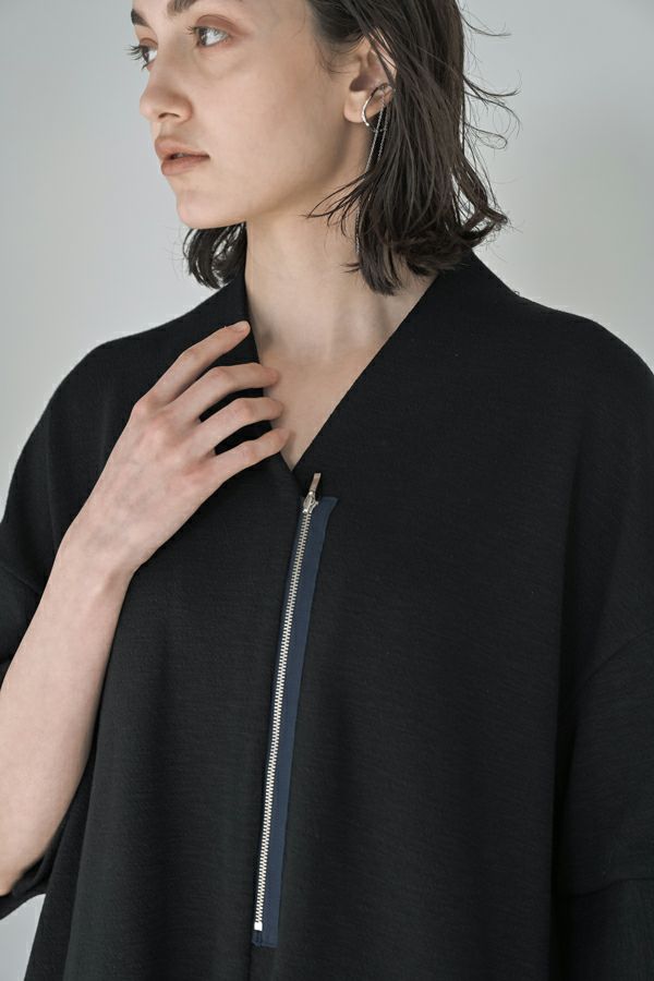 構築的シルエットで魅せる、マニッシュエレガンスなワンピース。 表面感のある綿ポリエステル糸を使用し、ハリと落ち感のバランスが美しい素材感が魅力。体のラインを拾いすぎず、凛としたシルエットを描くことで、着る人の存在感を惹き立てます。 デコルテが美しく映えるよう計算されたネックラインに、配色ファスナーをあしらい、開き具合で印象の変化も楽しめる仕様に。1枚で装いが完成する、モードな中に女性らしさが光るワンピース。 大人のための“マニッシュエレガンス”を、ぜひ体感してください。 ●手洗い可