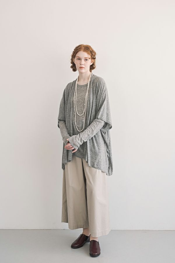 素肌が喜ぶしなやかな心地よさ、極上ウールのカーディガン。 今秋、新シリーズ「mocochi(もこち)」が登場。 カシミヤと同等の細い上質な羊毛、ウール100%のスーパーエクストラファインメリノを使用。通常は細くて編めないのですが、水溶性ビニロンと言う糸を補強糸に一緒に編みあげた後にお湯で水溶性ビニロン糸を洗い流すことで元糸だけが残るので混率も毛100%のままになっております。 肌に触れるアイテムなので自分自身を大切に思いやった一着です。シンプルなデザインなので気温差の激しい季節の変わり目に、半袖Tシャツやブラウス合わせてストール感覚でスタイリングがサマになります。 【ウールの優れた特徴】 ◎保温性に優れています。 ◎吸湿性・発散性に優れています。 ウールは汗を吸収すると同時に素早く発散。蒸れを抑え快適な状態を保ちます。 ◎防臭・抗菌効果 ◎肌に優しい 湿疹やアトピー性皮膚炎の患者さんに症状軽減をもたらす実験効果があります。 ◎地球に優しい ウール100%は天然で再生可能です。 同じmocochi(もこち)シリーズのニットプルオーバー(25228-1399Q-R・25228-1402Q-R)の上に羽織ったレイヤードコーデもお薦めです。 ●非常にデリケートな素材ですのでアクセサリー等の引っかけに注意して下さい。●糸及び編み組織の特性上、下垂れしやすいのでハンガーには掛けず、畳んだ状態で保管して下さい。 ●手洗い可
