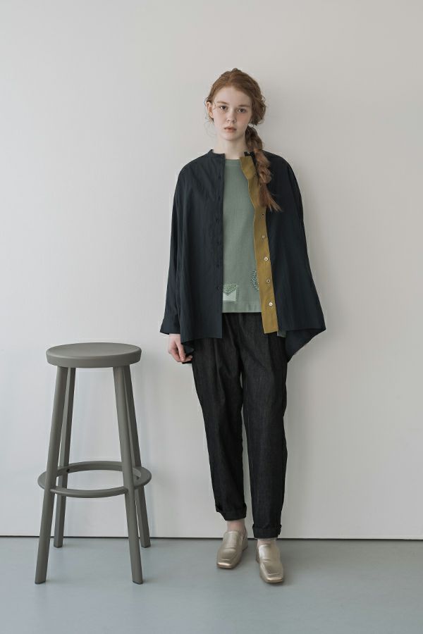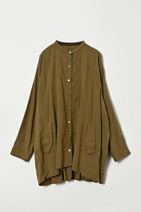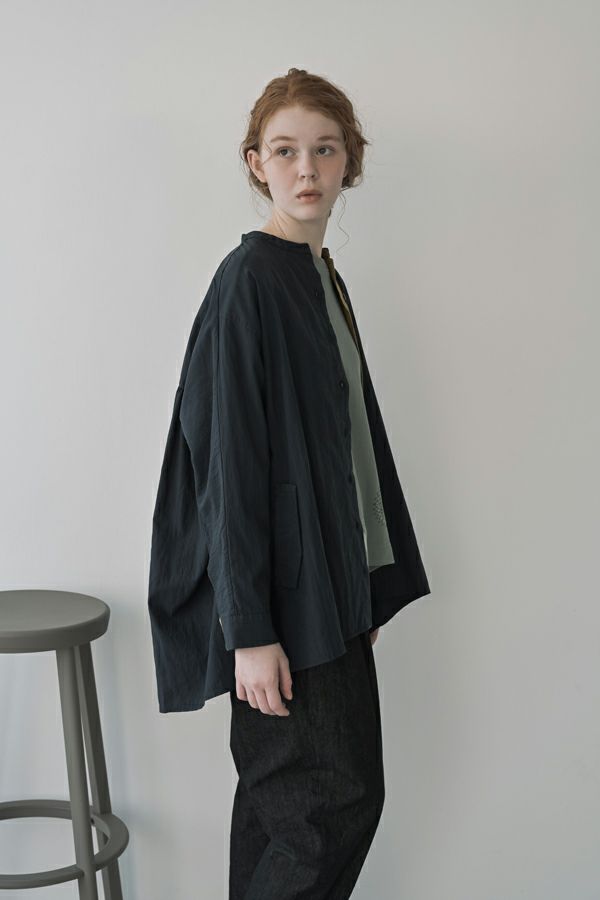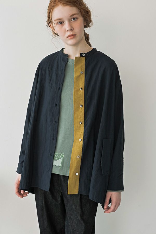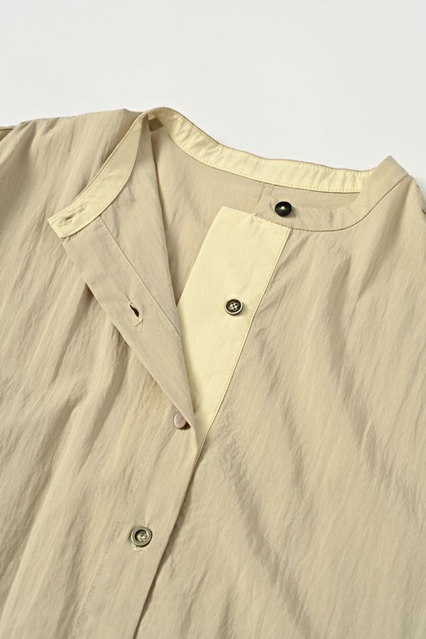 微光沢×ラフな質感が魅力、オンオフ使える羽織りブラウス。 ナイロン系の微光沢素材が大人っぽさを演出しつつ、製品洗いによるラフな表面感が程よい抜け感をプラス。きれいめにもカジュアルにもなじむ、万能アイテムです。 すべて種類の違うこだわりの小さなボタンが、他にはない遊び心をプラス。フロントはスポーティな印象で軽やかに、 バックスタイルはヨーク下にたっぷり入れたギャザーで、軽やか&モードな雰囲気に。前を開けると、配色の前立てがさりげなく新しい印象になり、前後で異なる表情を楽しめるデザインです。 デニムやカジュアルなボトムと合わせて、抜け感のあるスタイリングに。スカートやワンピースに羽織れば、フェミニンさと程よいモード感が絶妙なバランスに。カジュアルからきれいめまで、シーンを選ばない着回し力。さらっと羽織るだけで、いつものコーデをアップデートしてくれます。