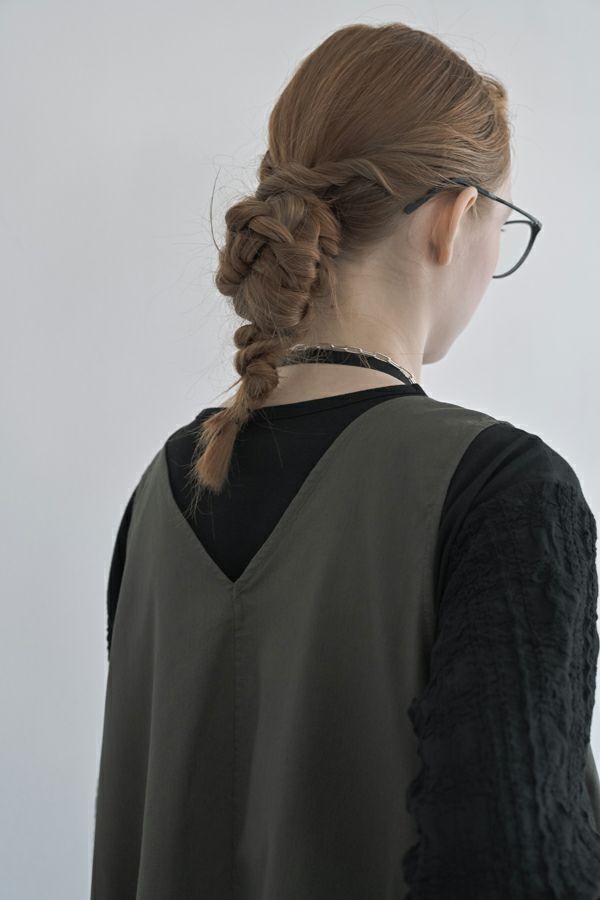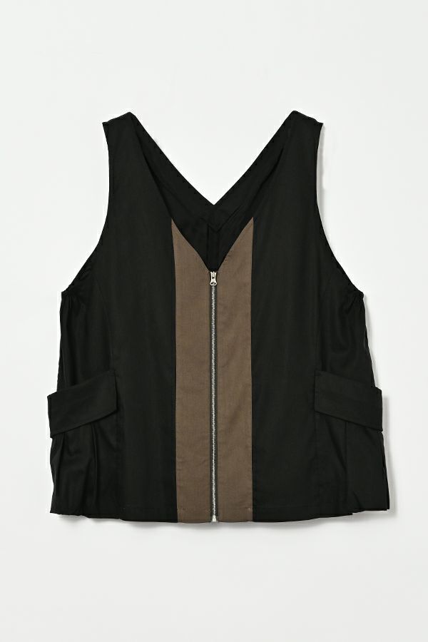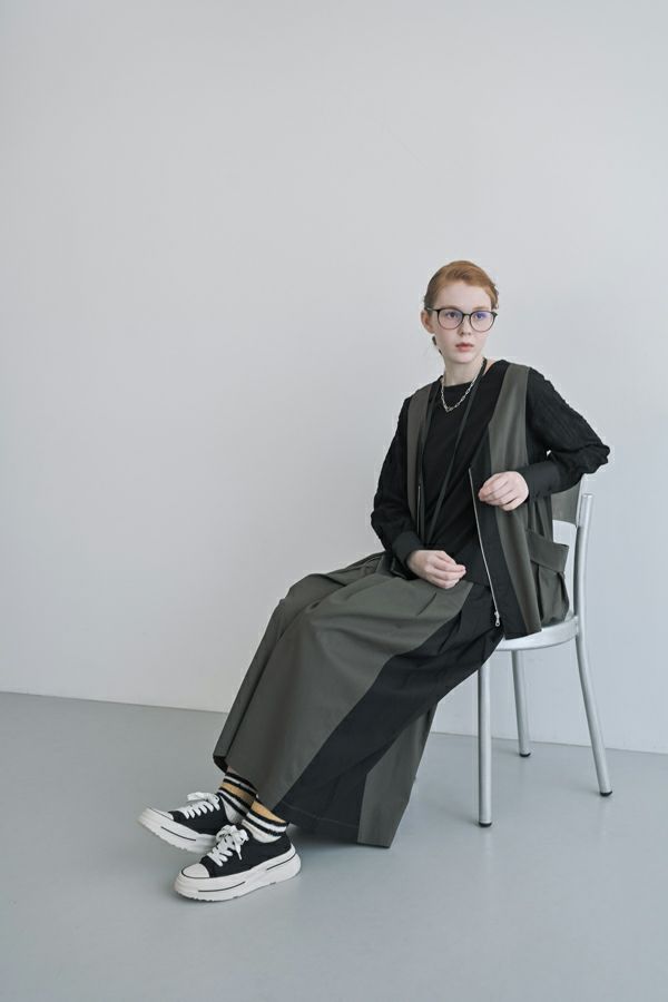 ヴィンテージテイストが香る、配色デザインショートベスト。 細かなシボ感とライトでソフトな風合いが特徴のヴィンテージ感漂う素材を使用。 絶妙な配色デザインが、どこか懐かしくも新しい印象を与えます。 袖ぐりにはゴムギャザーを施し、着心地の良さとさりげないボリューム感を演出。 サイドポケットの下部分には、ゆったりとしたバルーンシルエットを作り出し、立体感が際立つディテールが特徴です。 衿元は深いVネック仕様で、前身頃の切り替え配色が細見え効果を発揮。体のラインをカバーしつつ、スタイリッシュな印象をキープします。両脇の大きなフラップポケットは、実用性とアクセントを兼ね備え、どの角度から見ても洗練された雰囲気に。 トレンド感とクラシック感をバランスよく取り入れた一着で、コーディネートにひと味違う存在感をプラスします。 ●サイド切替タックパンツ(25228-9397F-R)とセットアップ可