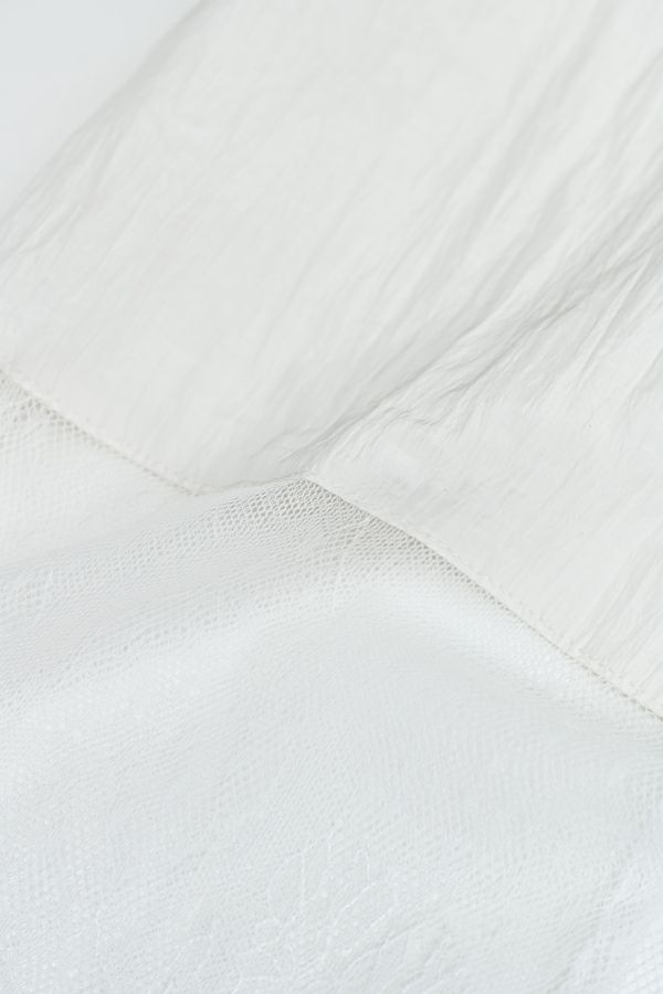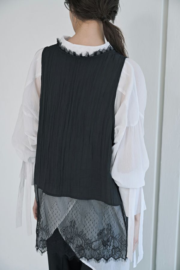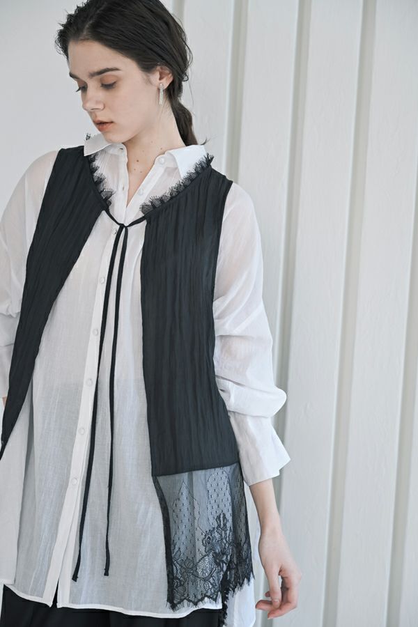 ヴィンテージライクな風合いが魅力、2WAYレースジレ。 マットサテンと繊細なレースの切り替えが、ランジェリーライクな上品さを演出。 衿ぐりにあしらったレースや、長めのリボンテープなど、細部までこだわりの詰まったデザインに仕上げました。 前後2wayで着用でき、リボンを後ろに持ってきてベストとしても活躍。レイヤードスタイルに取り入れるだけで、コーディネートにヴィンテージ感と女性らしいニュアンスをプラスしてくれる一着です。 薄手のロンTEE等のトップスにレイヤード。フェミニンな雰囲気を活かしつつ、デニムやチノパン、スラックスなどパンツスタイルと合わせることで、程よくカジュアルダウンした着こなしもおすすめです。
