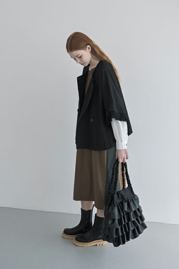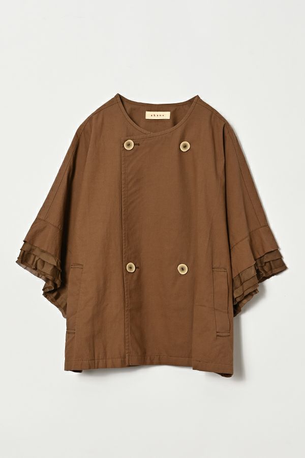 ロングシーズン着回せる、五分袖ショートジャケット。 短めの5分袖がベストのように気軽に羽織れる便利なライトアウター。裏なし仕様なのでロングシーズンにわたって活躍します。 身幅にはゆとりを持たせつつ、スッキリとしたバランスのクロップド丈が絶妙で、幅広い体型にも馴染みます。ノーカラーデザインが顔周りを明るく見せ、いろいろなコーディネートにマッチします。 製品洗いした綿素材は少しカジュアルな印象を与えつつ、同色系の切りっぱなしサテンフリルが袖口に施されており、ほんのり甘さをプラス。 今っぽいシルエットが可愛らしく、ワイドパンツやデニムパンツとのカジュアルコーディネートにぴったりです。また、スカートやワンピースにボレロ風に羽織ることで、エレガントな印象にもなり、シーンを選ばずに使えるアイテムです。