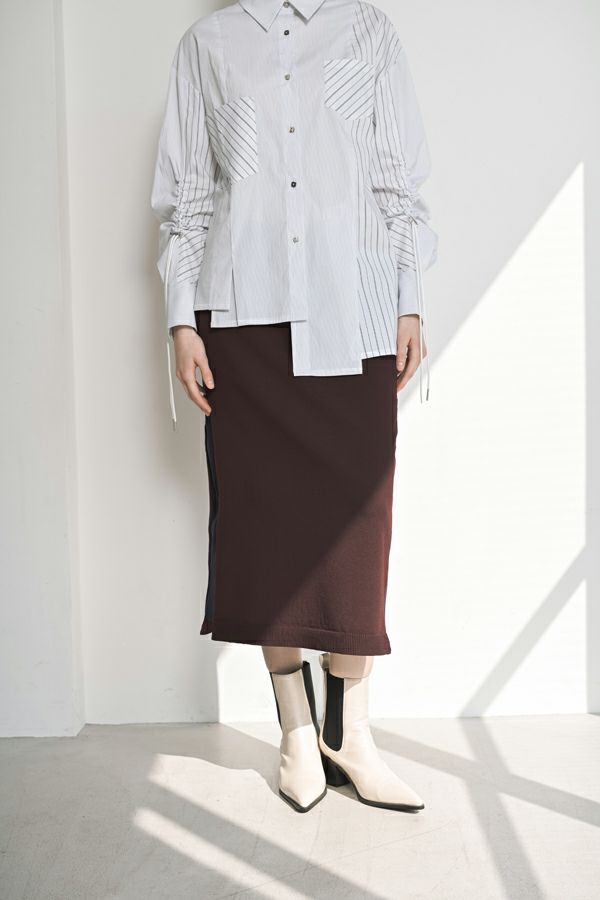 伸縮性抜群で着崩れしない、究極の大人美スカート。 落ち着いた配色のサイドラインテープが縦ラインを強調し、さりげないアクセントに。脇線には谷折りの編み目を施し、横から見たシルエットまでスッキリと美しく仕上げました。 腰周りのシルエットを女性らしく立体的に仕上がるように緻密に計算して編み立てつつ、サイドポケットも付けた万能スカート。 スポンジのような弾力と柔らかなハリ感が体のラインを拾わず、伸縮性抜群なので裾さばきも気にならないニットならではの心地よさを堪能できる一枚です。 ●ジオメトリープルオーバーT(25228-5368T-W)とセットアップ可 ●手洗い可