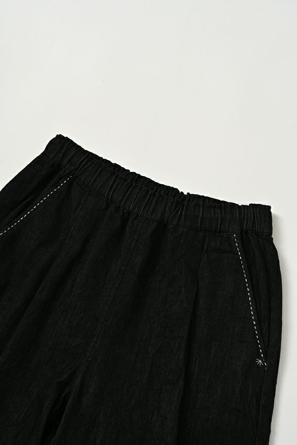 小ワザでお洒落がグッと惹き立つ、ドライタッチデニムパンツ。 春にご好評いただいたドライタッチデニムが、細かいワッシャー加工を施すことで色落ちを軽減し、さらに進化しました。 前タックは長めに縫い込んでお腹はスッキリ、腰周りはゆったり、裾に向かって細くなるタイプのシルエットです。(38号~Fのサイズ許容有り)総ゴムのウエストは、内側にコード(ひも)を配した仕様にしサイズ対応。 裾をロールアップさせると覗く配色パイピングがポイントです。(インディゴブルー×グリーン、黒×ピンク) あらゆるトップスに合わせやすく、腰周りにゆとりがあるのでショート丈でもバランスよく着こなせます。裾をロールアップすると、より引き締まった印象に仕上がります。●ドライタッチデニムベスト(25228-5398F-R)とセットアップ可 ●家庭洗濯の場合、風合いが損なわれますのでアイロンはお避けください
