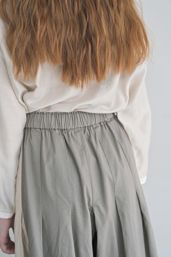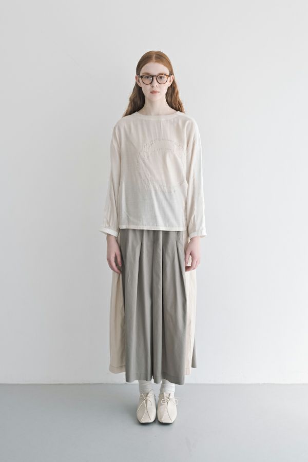 ヴィンテージの風合いが活きる、スカート見えワイドパンツ。 細かなシボ感とライトでソフトな風合いが特徴のヴィンテージ素材を使用。 何本も入れたタックがポイントとなり、まるでスカートのようなシルエットを生み出すデザイン。ヒップ位置までの中縫いが、お腹周りをやさしくカバーしてくれるので、リラックス感と美しいラインを両立しています。 9分丈に設定された少し短めのレングスが、身長を選ばずバランスよく着こなせるのも魅力。足元をすっきりと見せて、抜け感のあるスタイルを実現します。 ウエストには内側にコードを配し、調節可能な仕様で快適なフィット感をキープ。 脇の配色デザインが、カジュアルモードな印象をプラスし、コーディネートに新鮮なアクセントを加えます。 動きやすさとおしゃれ感を兼ね備えた一本で、デイリーコーデを格上げしてくれるアイテムです。 ●ジップアップライトベスト(25228-5449F-R)とセットアップ可