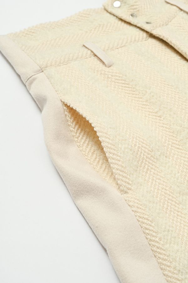 交差する温もりとエッジ。ウールツィードショートパンツ。 温もりのあるツイードの素材感と構築的な切り替えラインが織りなす立体シルエットで、スタイルに深みと緊張感をもたらし、都会的なムードを演出。 足元は白ソックス×パンプスで抜け感を加えて。トップスはタイトにまとめれば、丈感がより際立ち、バランスの妙が光るスタイリングに。オンにもオフにも着回せるからこそ、シーズンの軸になる一本です。 クラシックに偏りすぎない。甘さにも頼らない。 モードと知性を内包した、洗練のバランスボトム。 ●ウールツイード切替ベスト(25233-5731E)とセットアップ可