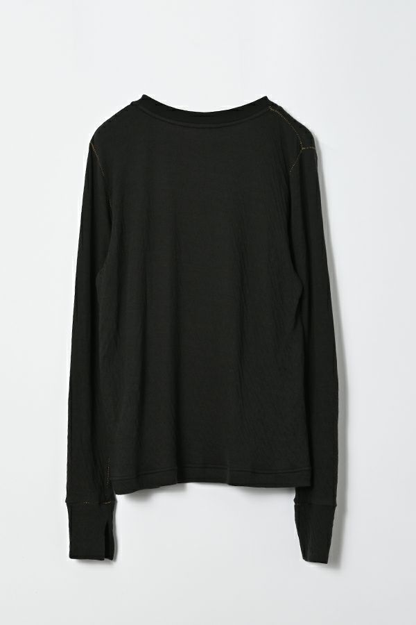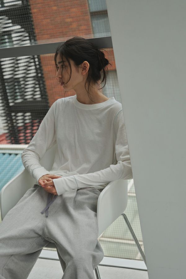 ラフに、かっこよく。心地よさを纏えるロンTEE。 肌にまとわりつかない ゆったりとしたサイジングに、ミニマルなデザイン。独特なハシゴステッチや配色ステッチが、シンプルな中に程よい主張を添え、1枚着でもレイヤードでも存在感を発揮します。 袖口には長めのカフスを配し、内側に入れたスリットがさりげなく動きを演出。メンズライクな雰囲気を漂わせながらも、女性らしいエッセンスを忍ばせた1枚。 素材は、空気を含んだ綿100%のダブルフェイス。2枚仕立ての程よい厚みと伸縮性が、身体をふわりと包み込み、気取らず過ごしたい日にも、自然と手が伸びる心地よさを叶えます。 ●日本製