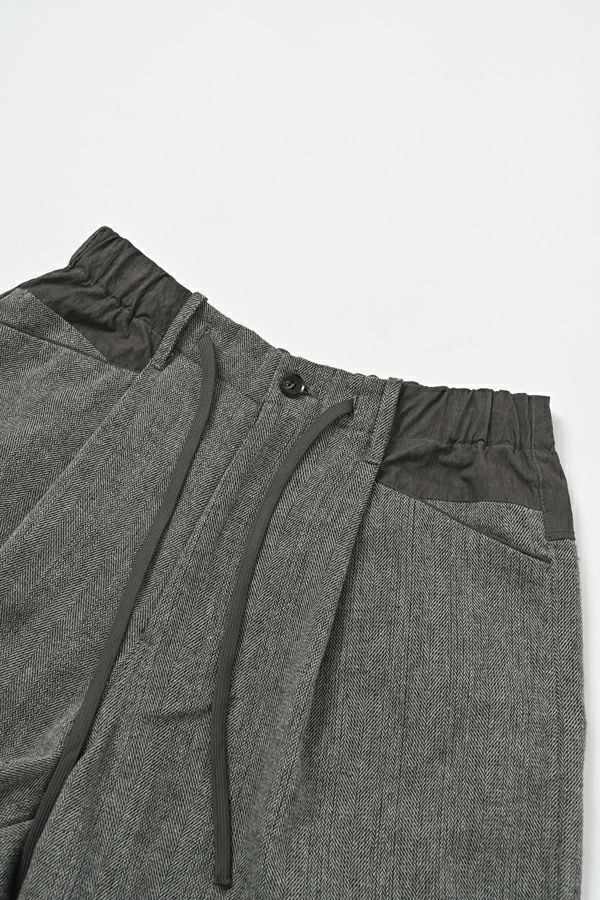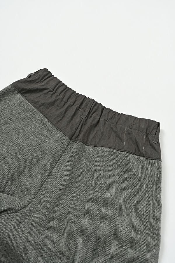 気負わず、品よく。計算されたシルエットのイージートラウザー。 リラックスした穿き心地なのに、きちんと見えが叶う。そんな理想をかたちにした、太めテーパードのイージーパンツ。 ヒップ周りは適度なゆとりで動きやすく、膝下からすっきりとテーパードしたラインが、大人のカジュアルに上品さを添えます。大きめのタックで横から見たときの立体感も◎。 ウエストは後ろゴム+コード仕様でサイズ調節可能に。コード先を表に出さずに着用できる、考え抜かれたデザインに注目。裏から紐を引っ張り、内側で絞めるとフロントが垂れてしまうことがありますが、帯裏のベルトループに紐を通すと軽減できるようになっています。見た目もすっきりしたウエストに。 素材には、ウールのような表情をもつポリエステルのランダムヘリンボーンを採用。太さの異なる織り柄がさりげないニュアンスを生み、ほどよいハリ感でシルエットもきれいにキープ。オン・オフ問わず活躍してくれる一本です。