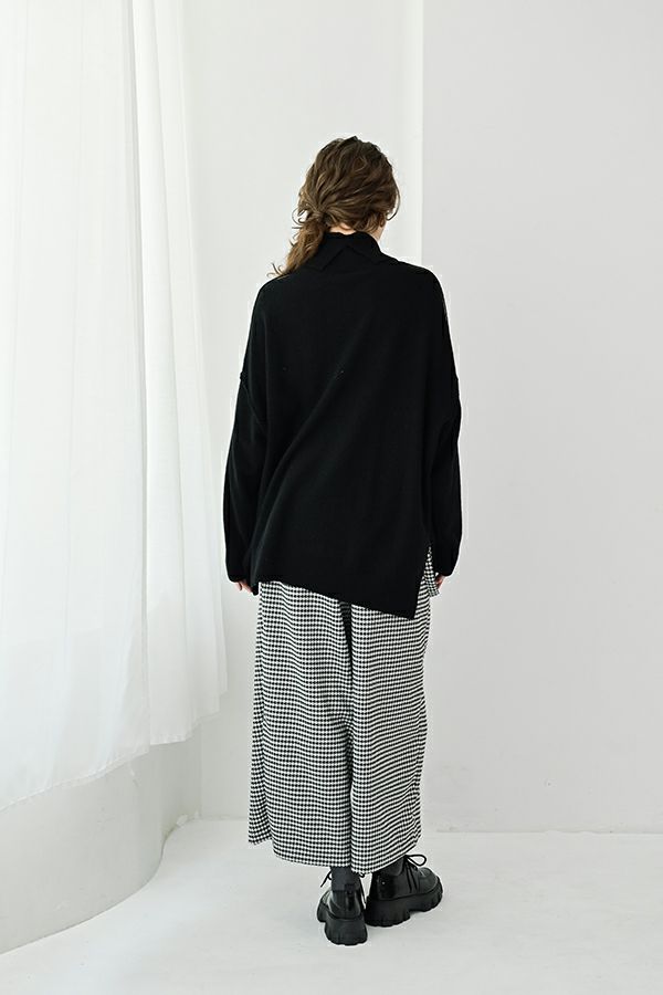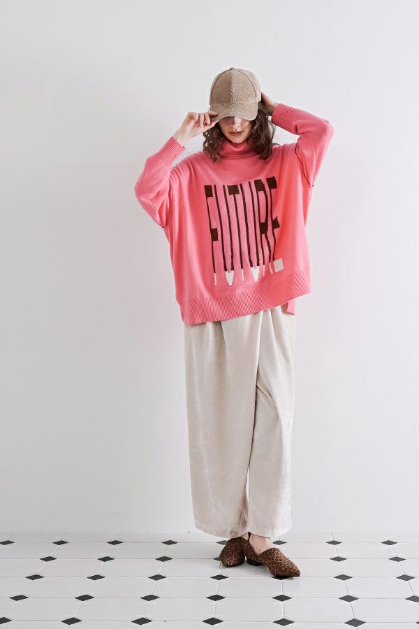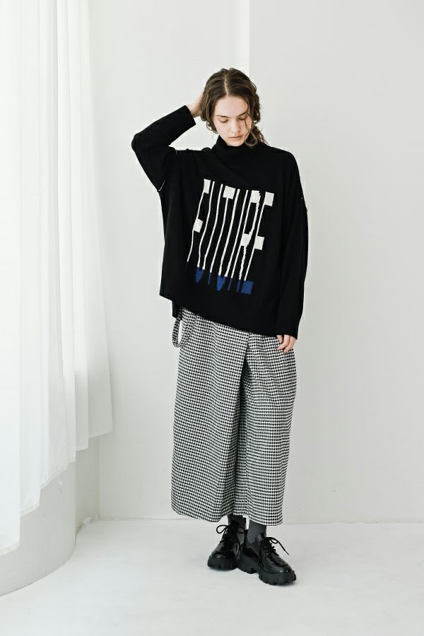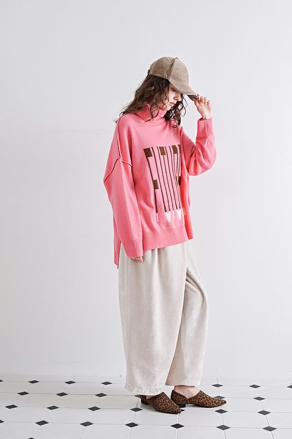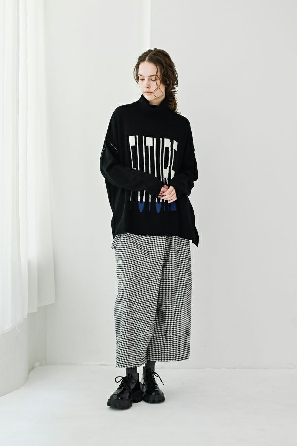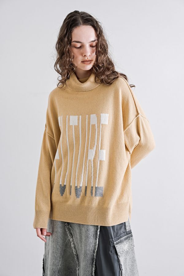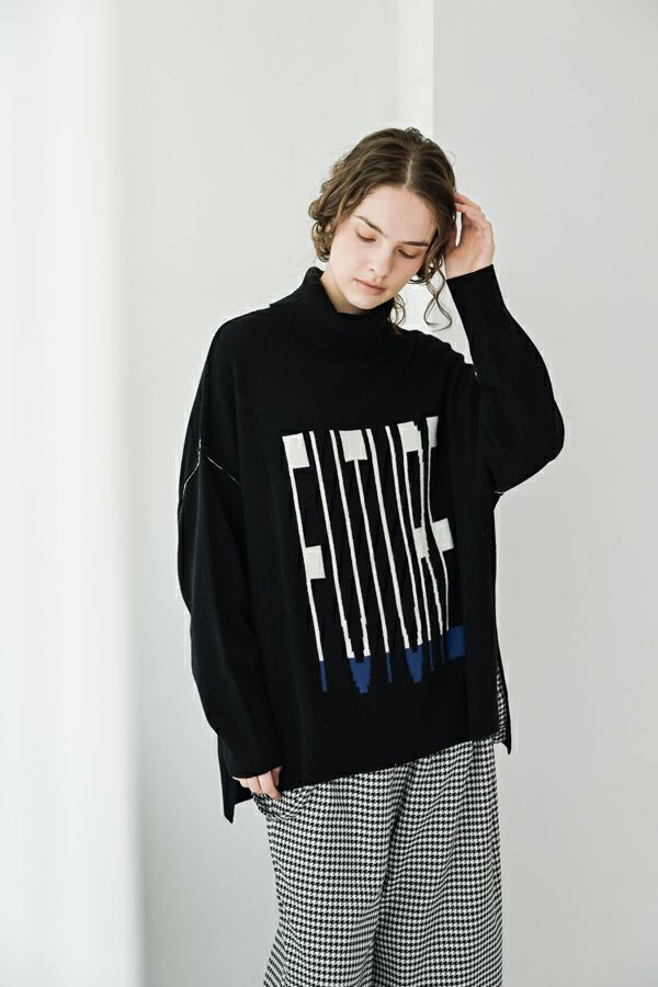 抜け感に、遊び心を。エフォートレスに着映えるロゴニットプルオーバー。 身体のラインを拾わない力の抜けたシルエットが醸し出す大人の余裕に大胆なロゴ使いが目を惹く着映えアイテム。 程よくゆとりのオフタートルはバックスリットを入れて後ろ姿も抜け感をもたせています。肩とアームホールは縫い代を出した配色ステッチが遊びを演出。 スッキリシルエットのボトム合わせでYラインシルエットコーデも良いですし、落ち感ある素材のボトムと合わせてこなれ感漂うスタイリングもお楽しみいただけます。