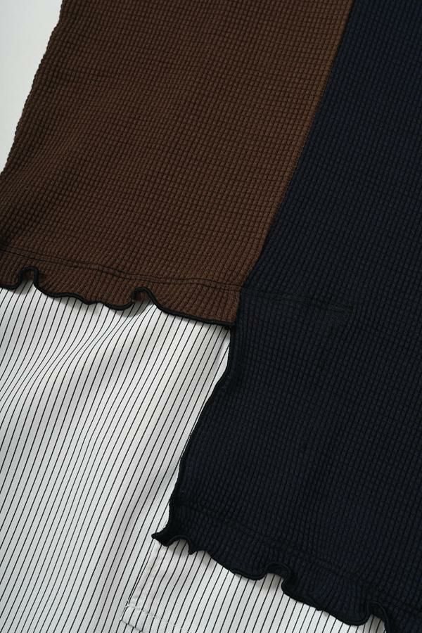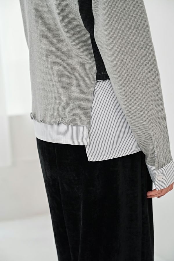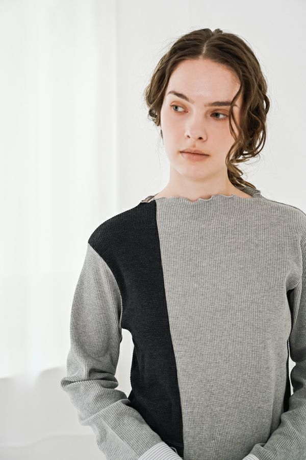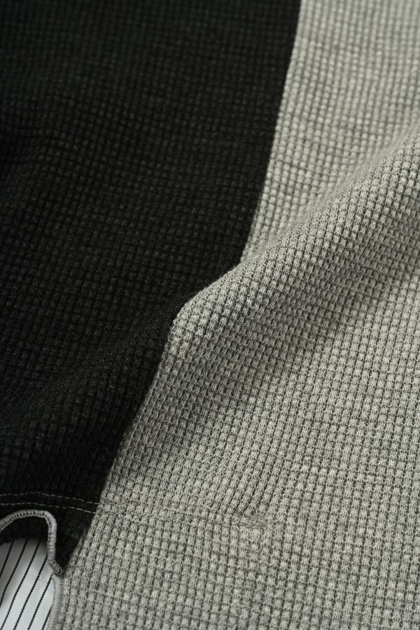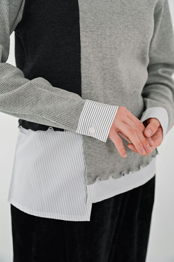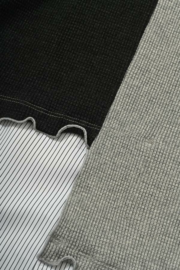 計算されたニュアンスで魅せる、モードなプルオーバー。 ワッフル組織のサーマル素材が生む、ふっくらとした空気感と快適な肌離れ。凹凸のある表面が熱をため込み、暖かさと軽やかさを両立します。 脇に濃色を効かせた配色切り替えが、さりげなく細見えを演出。袖口と裾にはシャツ地のストライプを重ね、レイヤードしたような奥行きをプラス。 低めのボトルネックは首元を優しく包み込み、大人の抜け感を惹き立てます。一枚で装いが決まる、機能美とモード感を備えた洗練プルオーバー。