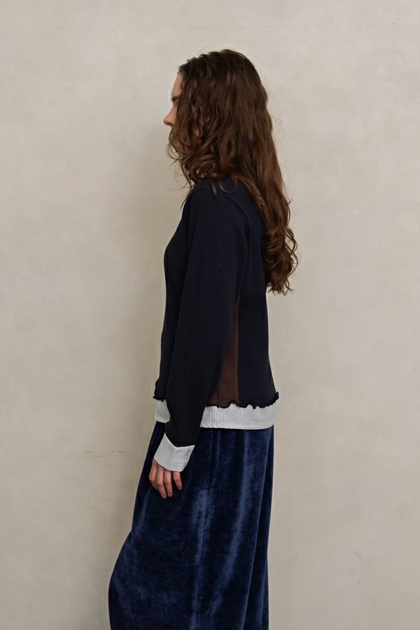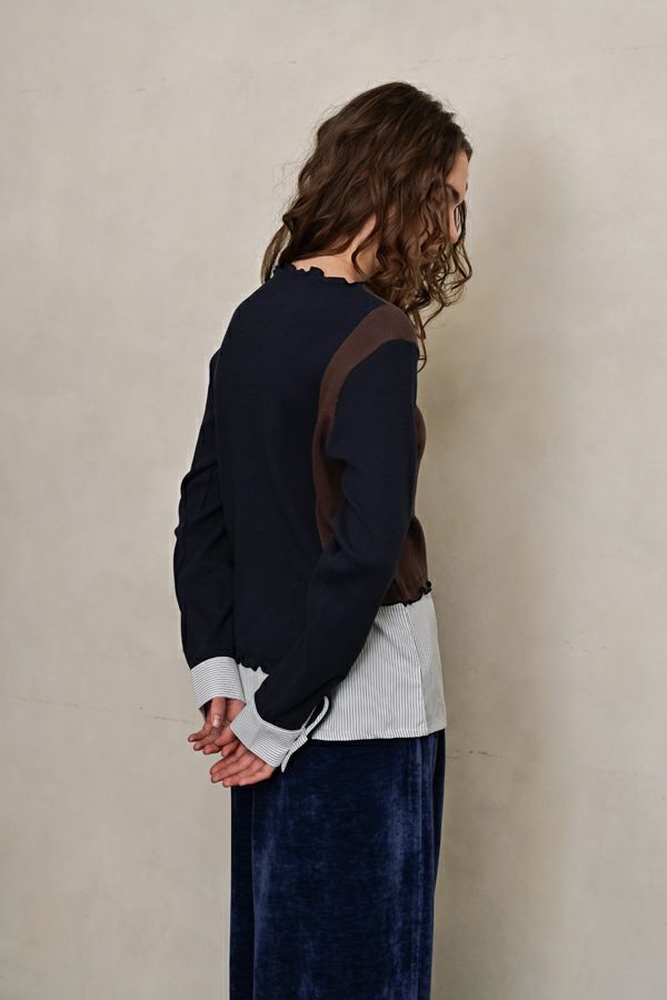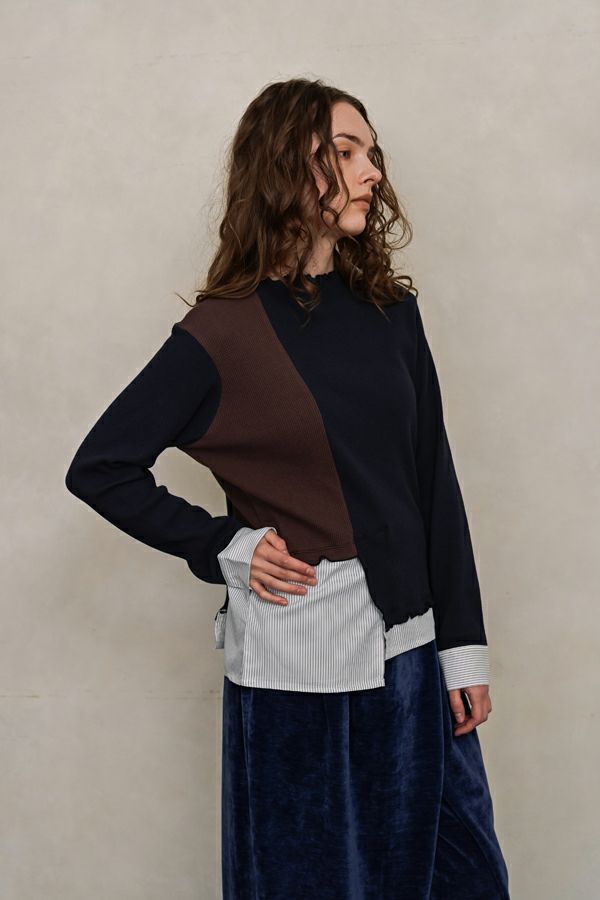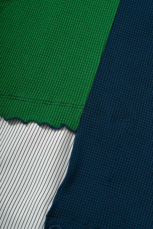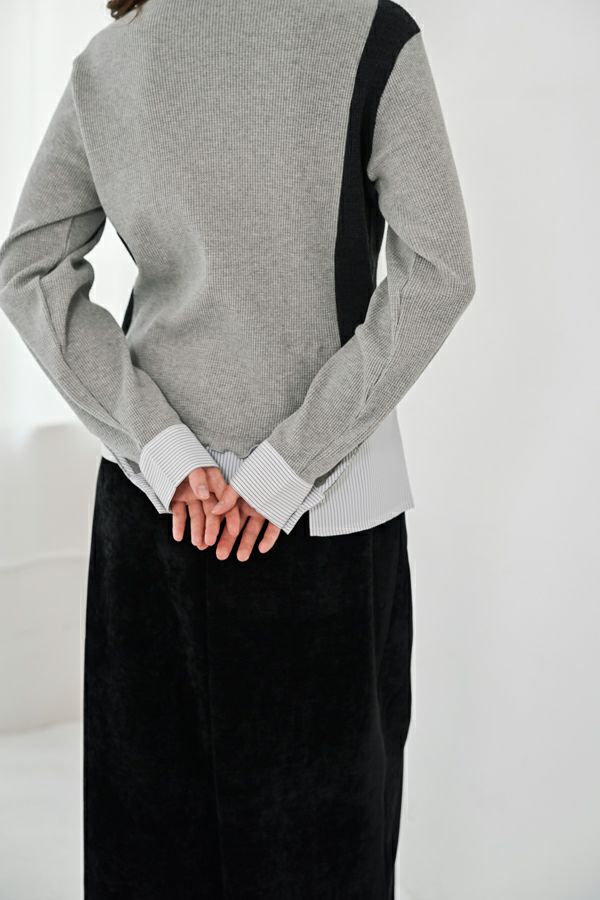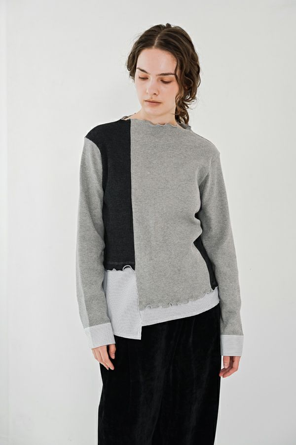 計算されたニュアンスで魅せる、モードなプルオーバー。 ワッフル組織のサーマル素材が生む、ふっくらとした空気感と快適な肌離れ。凹凸のある表面が熱をため込み、暖かさと軽やかさを両立します。 脇に濃色を効かせた配色切り替えが、さりげなく細見えを演出。袖口と裾にはシャツ地のストライプを重ね、レイヤードしたような奥行きをプラス。 低めのボトルネックは首元を優しく包み込み、大人の抜け感を惹き立てます。一枚で装いが決まる、機能美とモード感を備えた洗練プルオーバー。