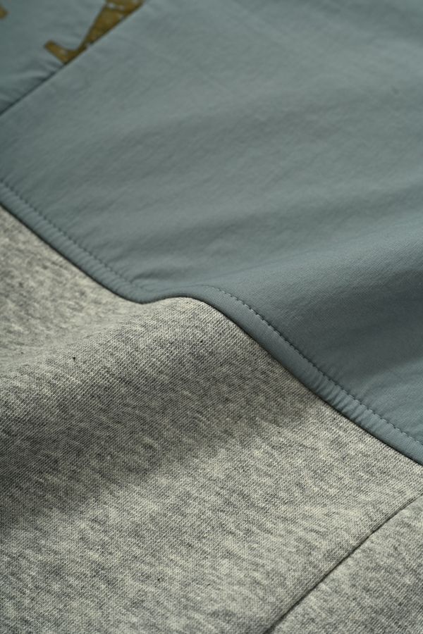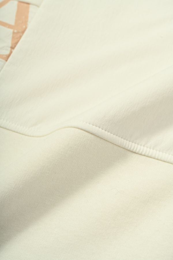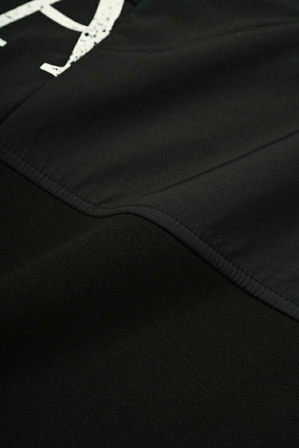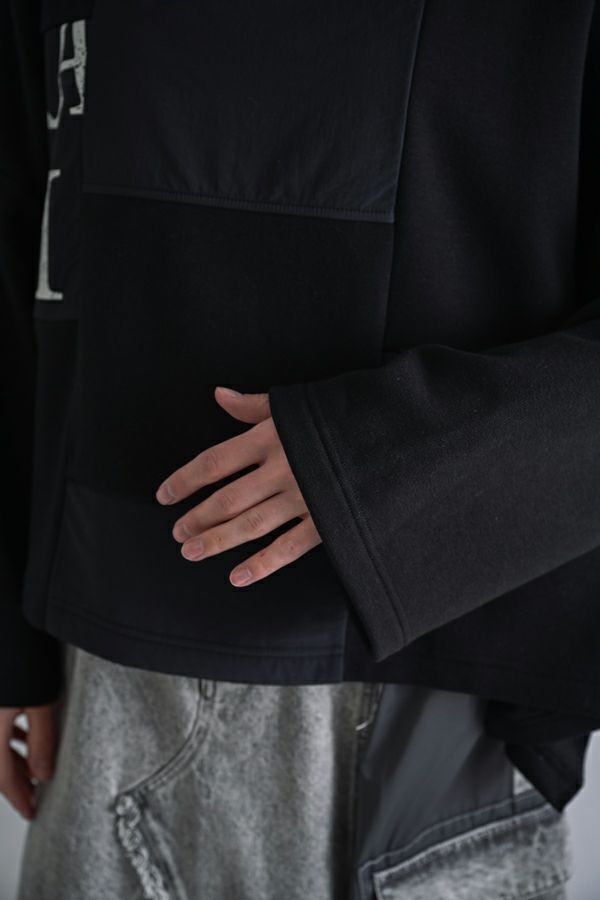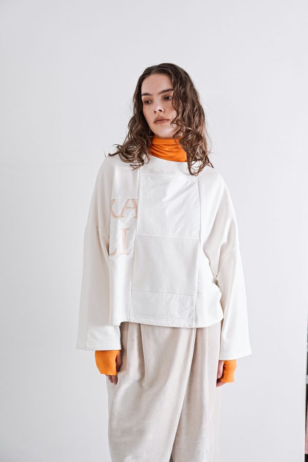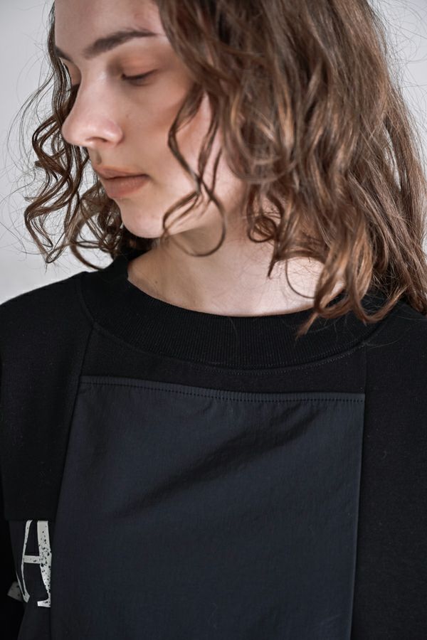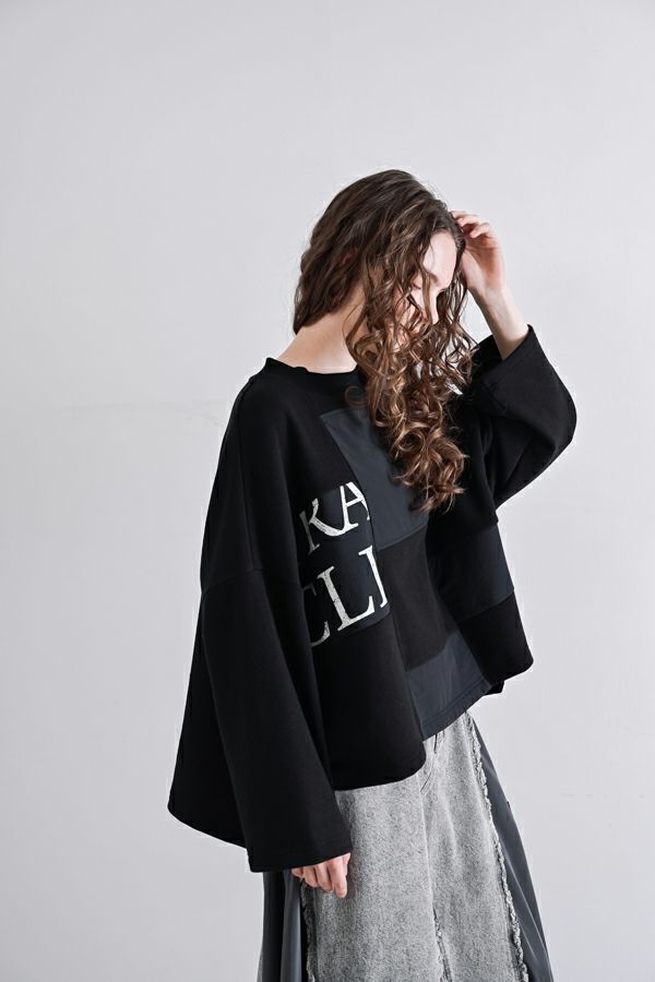 構築的なやわらかさ、モードを纏う大人プルオーバー。 スポンジのような弾力と柔らかいハリ感を備えた素材が、立体的なシルエットをキープ。布帛とカットソーを市松風に切り替えたデザインが、奥行きのある表情をつくります。 右サイドに施したブロック状のパッチワークのひとつには、アンティーク調のロゴをあしらい、さりげないアクセントに。身幅はゆったりとしたビッグシルエットで動きやすく、ヒップラインをさり気なくカバーする丈感。 広めにとったアームホールと袖口は、シャツやブラウスとのレイヤードにも対応し、着こなしの幅を広げます。 抜け感と存在感を両立した、大人のためのモードカジュアルに。