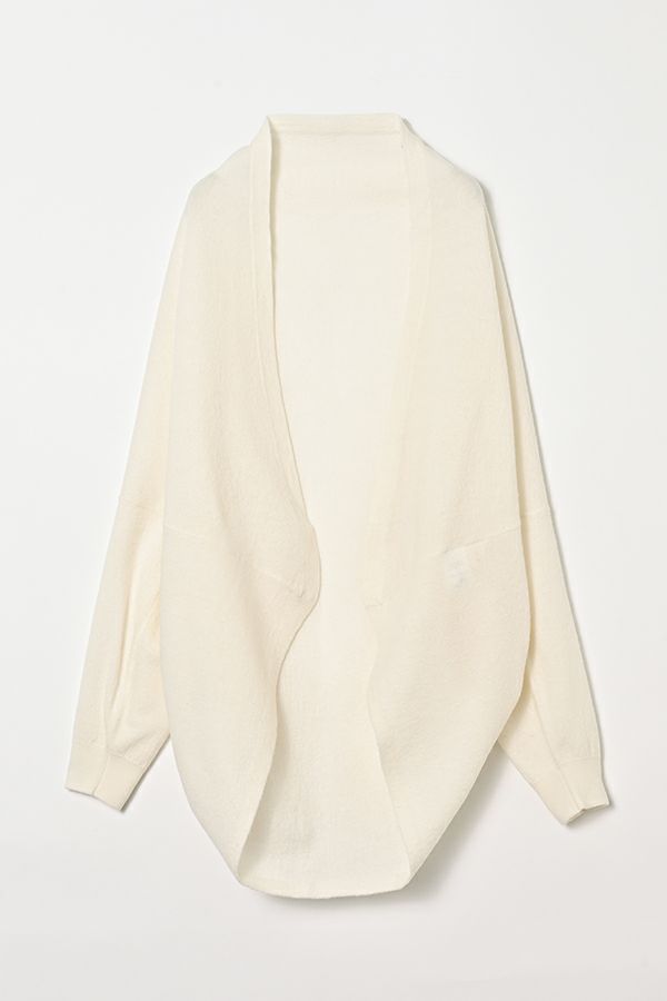 包まれる心地よさ、クラス感まとうショールカーディガン。 24AWでご好評いただいた圧縮ショールカーディガンが今季も新色を加え再登場。 圧縮ニットならではの軽さと温もり、そしてフェルトのような上質な風合いが魅力です。ニット本来の伸縮性を保ちながら、加工段階でフェルト化させることで、優れた保温性を実現しました。 女性らしいシルエットで、軽くて柔らかく全身を包み込むような暖かなアイテムになっています。リラクシーに着用できるルーズなシルエットは、コーディネートに取り入れるだけでこなれた印象に仕上がり、デイリーから旅先まで幅広く活躍します。 ●圧縮ハイネックプルオーバー(25238-1802R-R)とアンサンブル着用も可