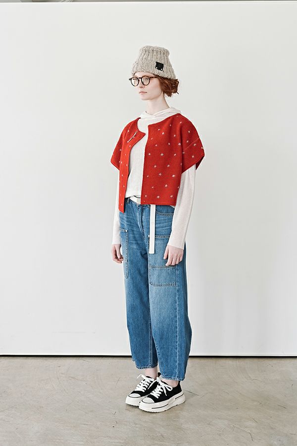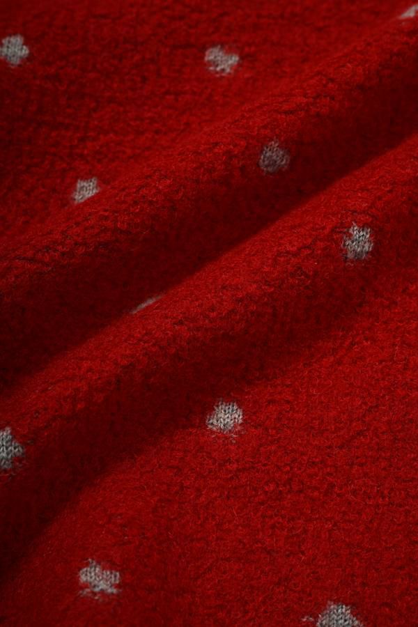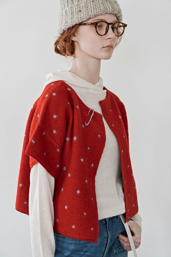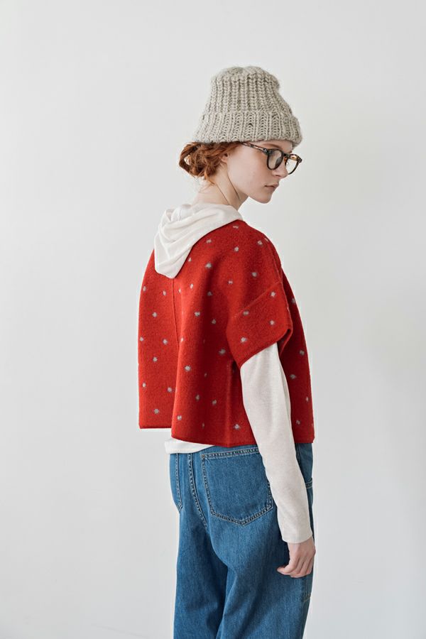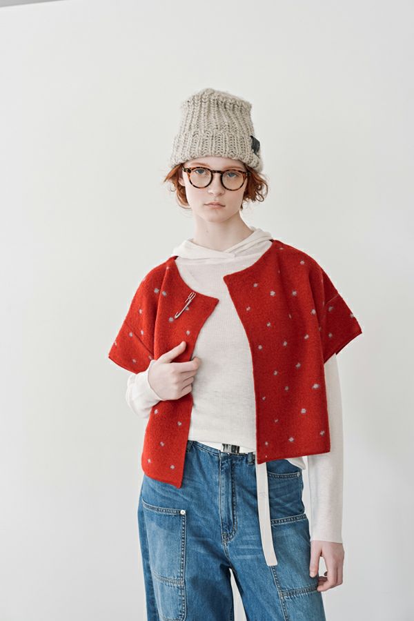 上質なぬくもりで包み込む、大人のパイルベスト。 肌寒さを感じる季節の羽織りとしてはもちろん、ベストとしてのレイヤード、そしてキュートに装いのアクセントとしても活躍する、マルチに着まわせる一枚。 毛100%の糸を贅沢に使用したパイル編み仕立ては、まるで極上の絨毯のような見た目と心地よい肌触りを兼ね備え、体を包み込むような暖かさを叶えます。 いびつなドット柄が程よい抜け感を演出し、付属のキルトピンで留め方を変えれば印象チェンジも自在に楽しめます。 ノーカラーデザインは顔まわりをすっきりと見せ、シアー素材やカットソーとのレイヤードも軽やかに決まります。コンパクトな丈感はボリュームのあるボトムスと好相性。ワンピースとのレイヤードもレディーライクコーデでお楽しみいただけます。