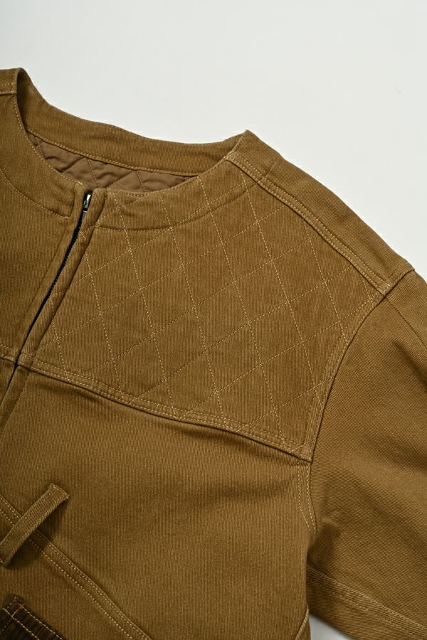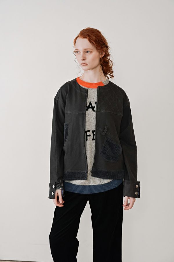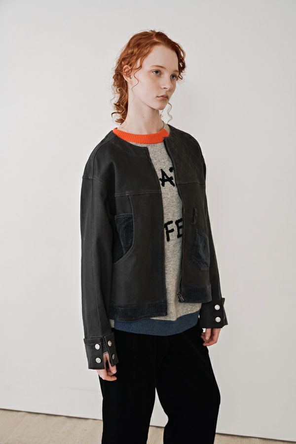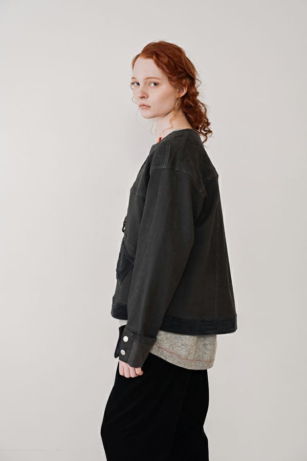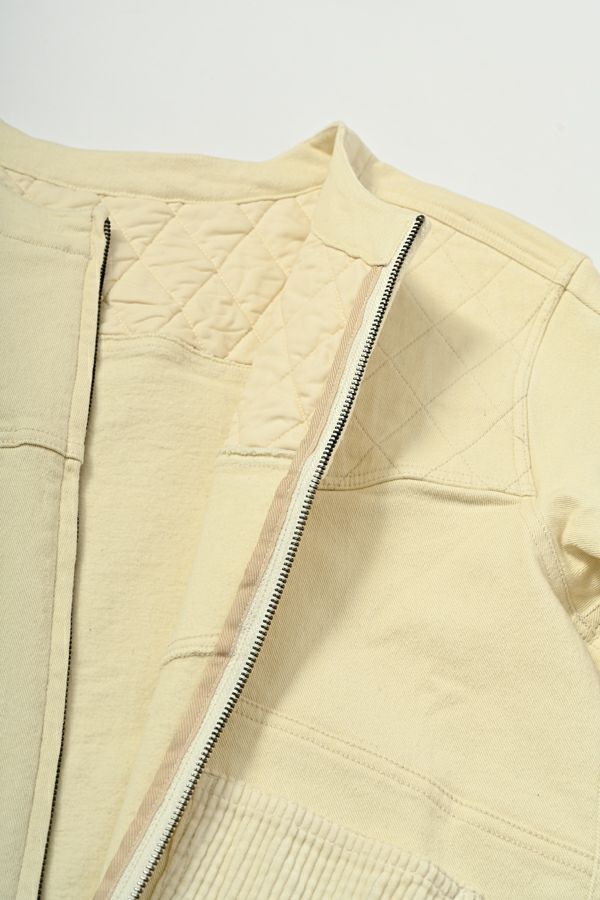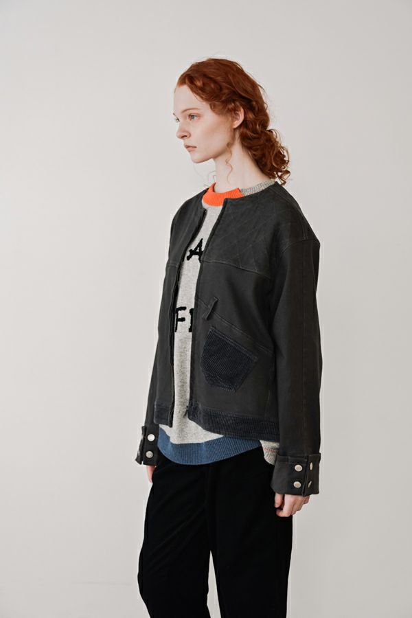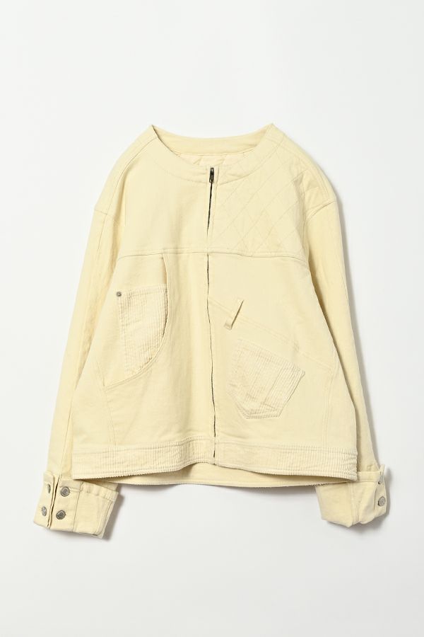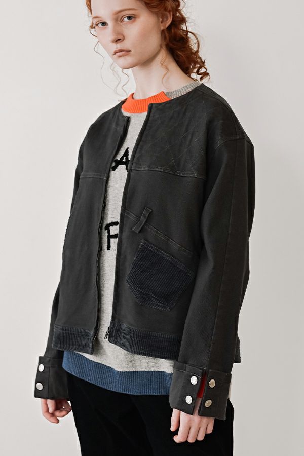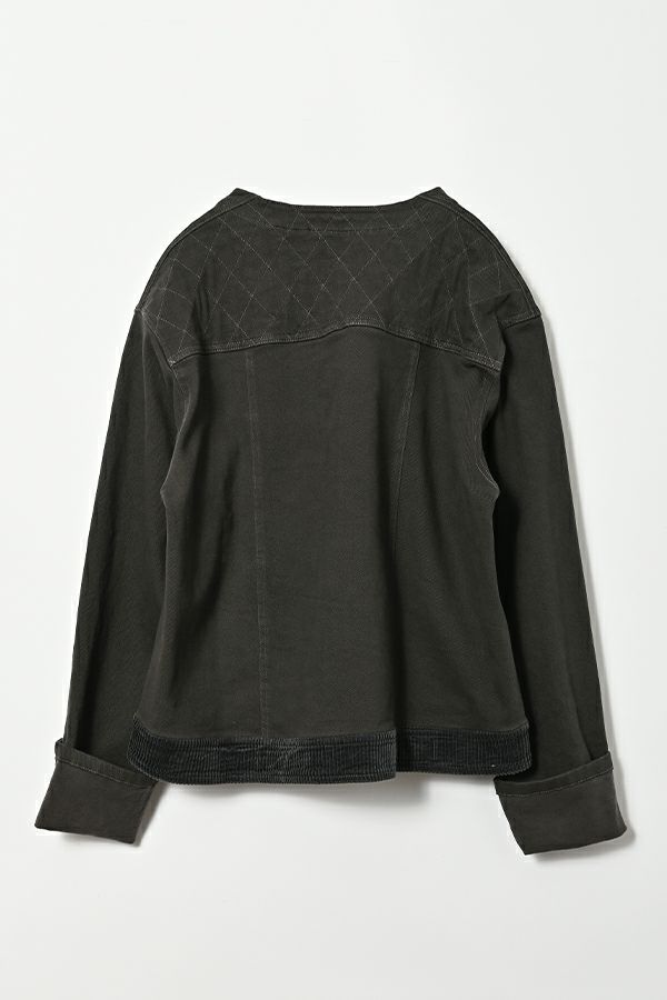 さりげなく、こなれて。女らしさも叶える大人ジャケット。 中肉の裏起毛ストレッチ素材を使用し、製品洗いをかけることで、ほどよい温もりとやわらかな着心地を両立。ツイル地の奥行きある表情に、ヴィンテージライクなこなれ感が宿り、ナチュラルながらも洗練された佇まいに仕上がりました。 すっきりとしたノーカラーと、ほどよくゆとりのあるシルエットは、アウターとしてもコートインでも着回し自在。左肩と後ろヨークに施したキルティング切り替えが、さりげない立体感を添え、バックスタイルまで印象的に。 どんなボトムともバランスよく合わせられるボックスシルエットは、カジュアルにもきれいめにもフィットします。シーズンの端境期にこそ頼れる、ワードローブに加えておきたい万能ジャケットです。 ●裏起毛ストレッチパンツ(25238-9628M-R)とセットアップ可
