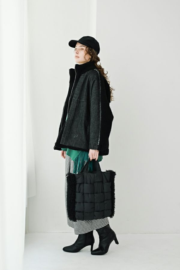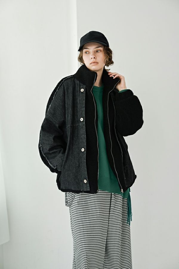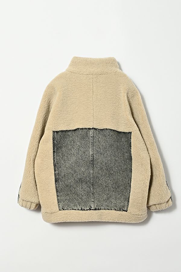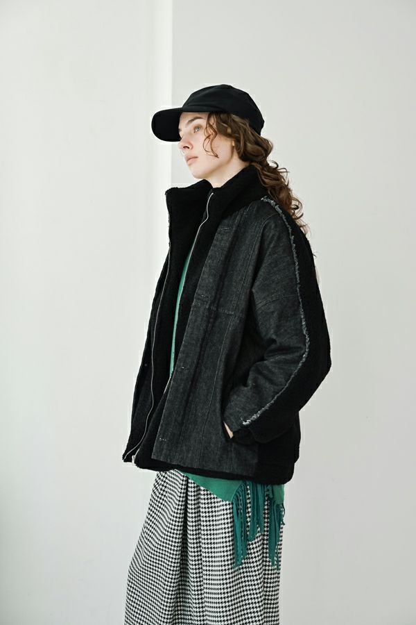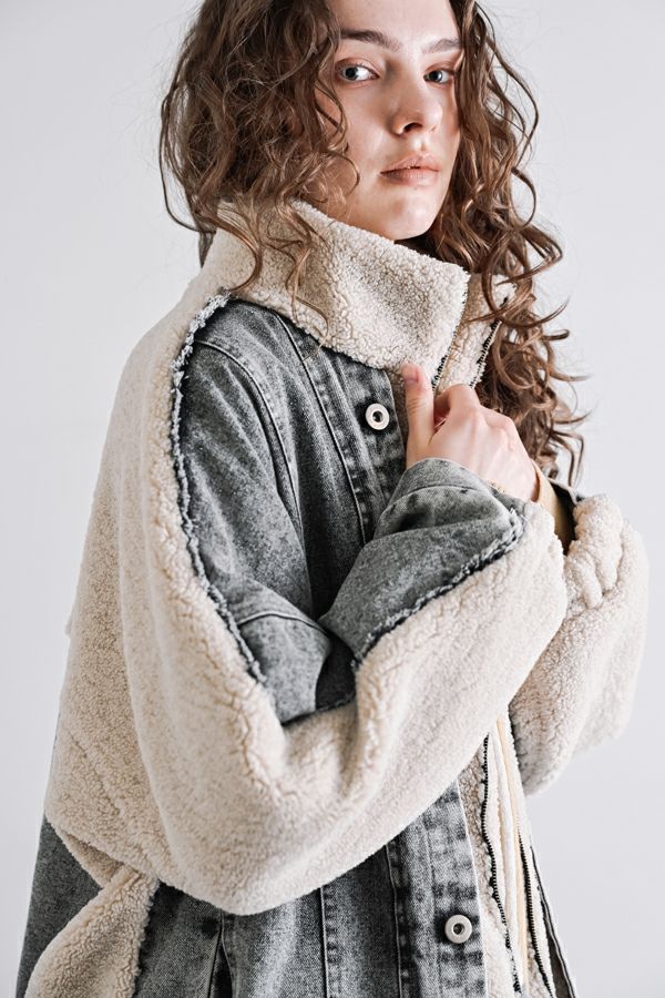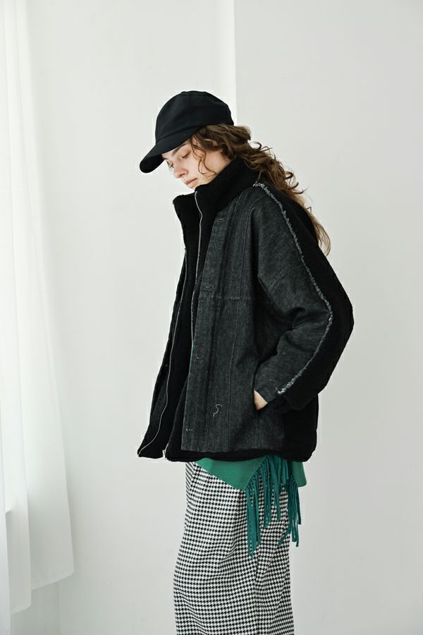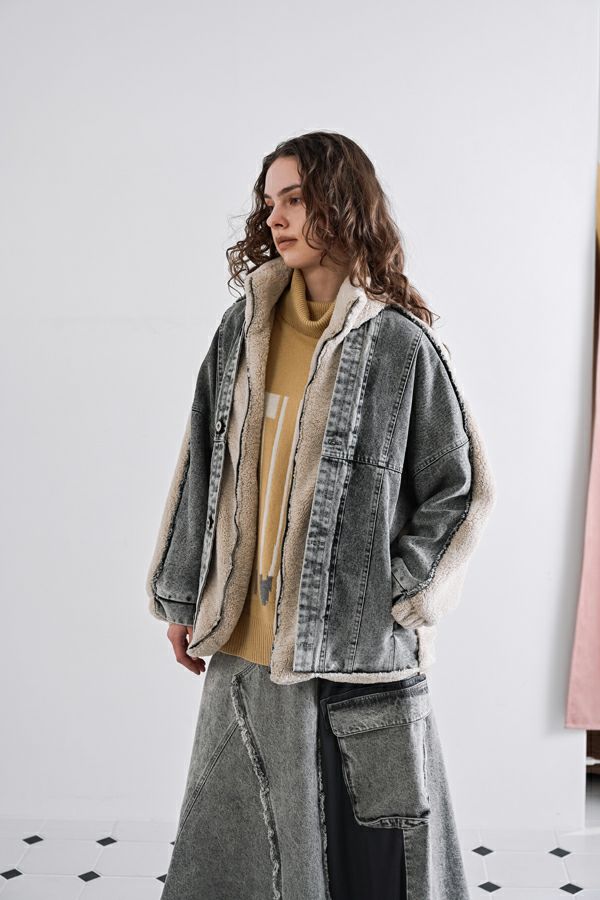ラフさに宿る、洗練の余裕。異素材で魅せる大人カジュアルなジャケット。 ケミカルデニムとアンティーク調のボアを掛け合わせた、表情豊かな異素材コンビ。後ろ身頃はあえて重くなりすぎないよう、中心にデニムを切り替え、軽やかな動きと奥行きをプラス。ヒップが隠れる長めの丈感で、抜け感と安心感を両立させました。 フロントはファスナーを閉めずに、タック釦だけで留めるスタイルもおすすめ。 ゆったりとしたサイズ感と暖かく包み込むボアの風合いが、大人のアクティブカジュアルを惹き立てます。ほどよいラフさとモード感が交差する、デイリーに頼れる洗練ジャケットです。 ●デニムスカート(25238-8090P-W)とセットアップ可
