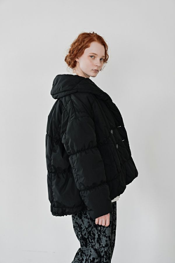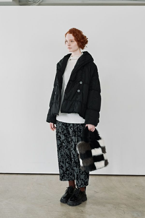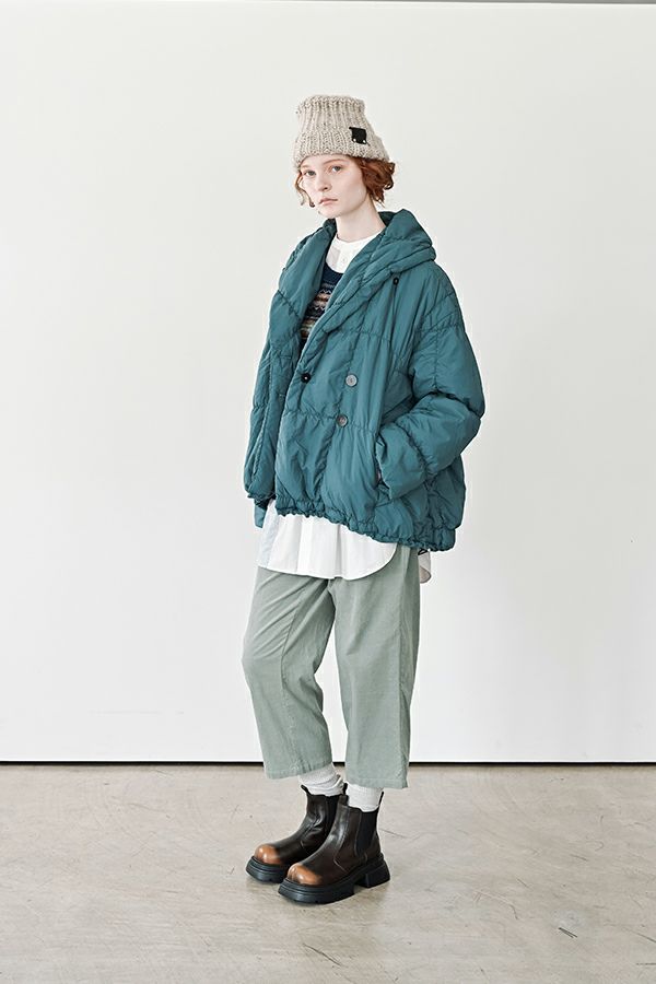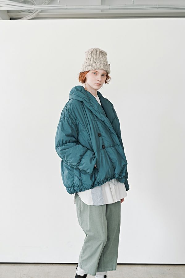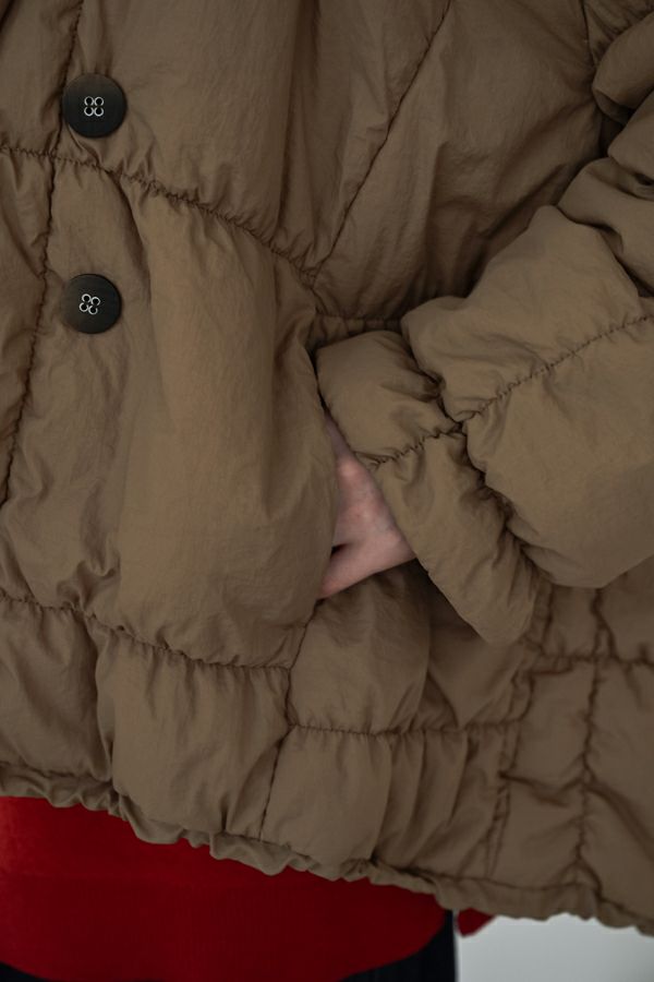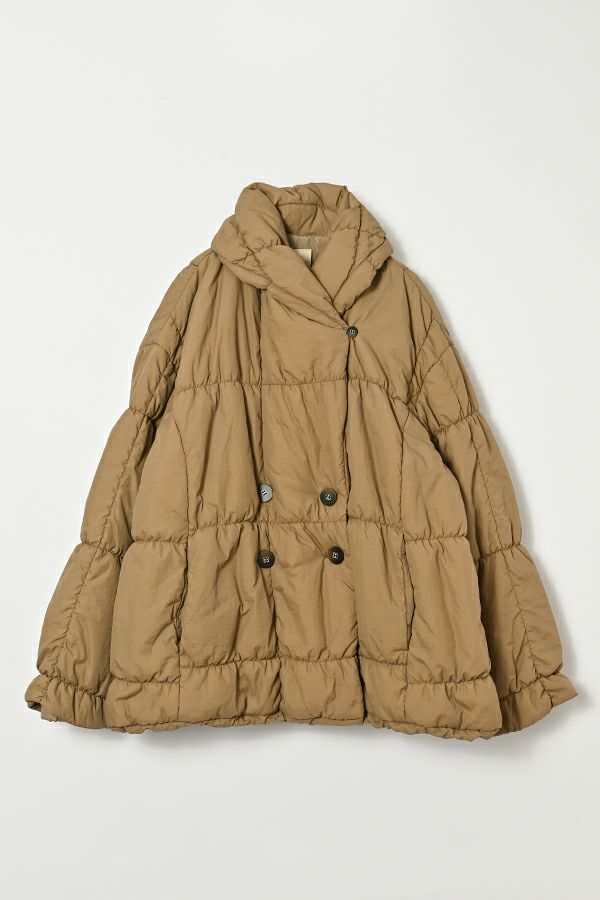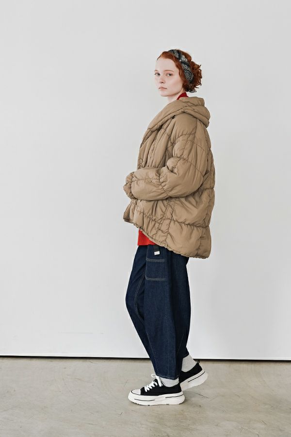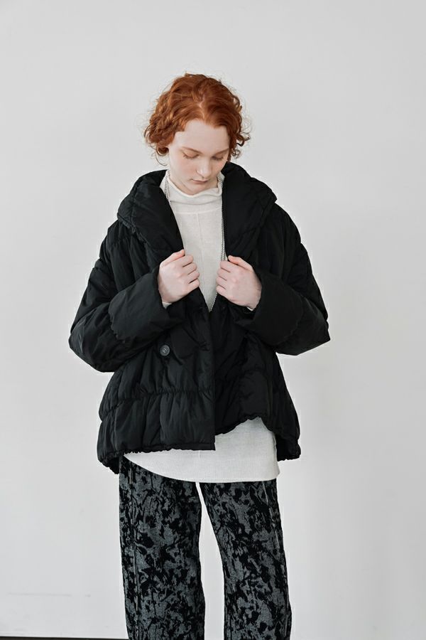 空気を纏うような軽やかさ。品よく暖かい、大人のシャーリングコート。 20デニールのナイロンを使用し、akane史上もっとも軽やかで柔らかな着心地を実現した一着。生地と中綿を一緒にギャザー加工することで生まれた独特の凹凸感が、奥行きのあるニュアンスを演出。ボリュームのあるシルエットながら、驚くほど軽く、しっかりとした防寒性も兼ね備えています。 上品なショールカラーは、首元まで閉じても開けても美しく決まり、スタイリングに合わせて印象を変えられる優秀デザイン。裾のドロスト仕様でシルエットをアレンジすれば、気分に寄り添う着こなしが完成します。 エレガンスと機能性を両立した一着は、この冬、きっと手放せなくなる存在に。 ●家庭洗濯では中綿が偏ってシルエットがきれいにならないので必ずクリーニングに出して下さい。