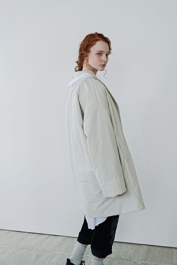 軽やかに纏う、洗練されたシンプル。着まわし力で選ぶ、大人コート。 ドロップした肩まわりには程よいゆとりをもたせ、裾にかけて緩やかに落ちるソフトコクーンシルエットが、ナチュラルな女性らしさを惹き立てます。ペーパーライクな質感と柔らかな光沢を併せ持つ生地は、シワになりにくく、長時間の着用でも着崩れしにくいのが魅力。 小さめの衿とラペルが顔まわりをすっきりと見せ、大きめのクルミボタンがさりげないアクセントに。ゆとりのあるシルエットで中に厚手のニットも楽に重ねられ、季節の変わり目から真冬まで、着まわしの効く万能コートです。 ●配色パッチ中綿コート(25238-7652G-R)の無地タイプ:着丈は8cm短い90cm丈 ●家庭洗濯では中綿が偏ってシルエットがきれいにならないので必ずクリーニングに出して下さい。