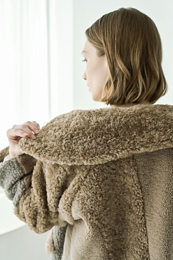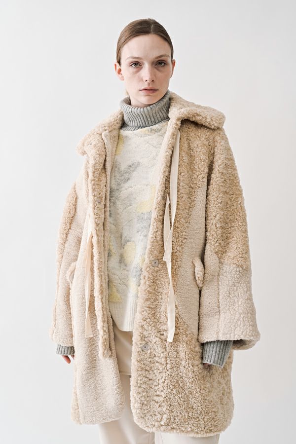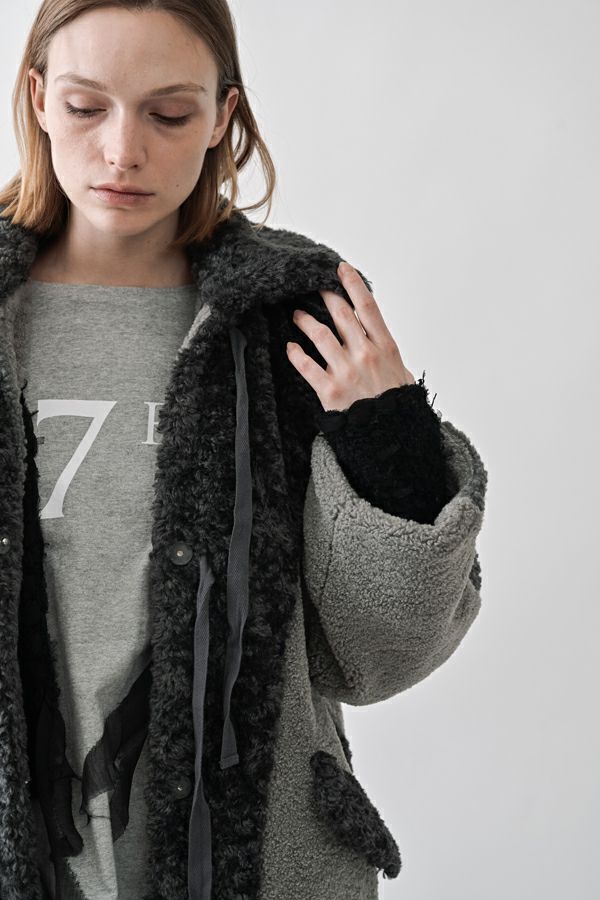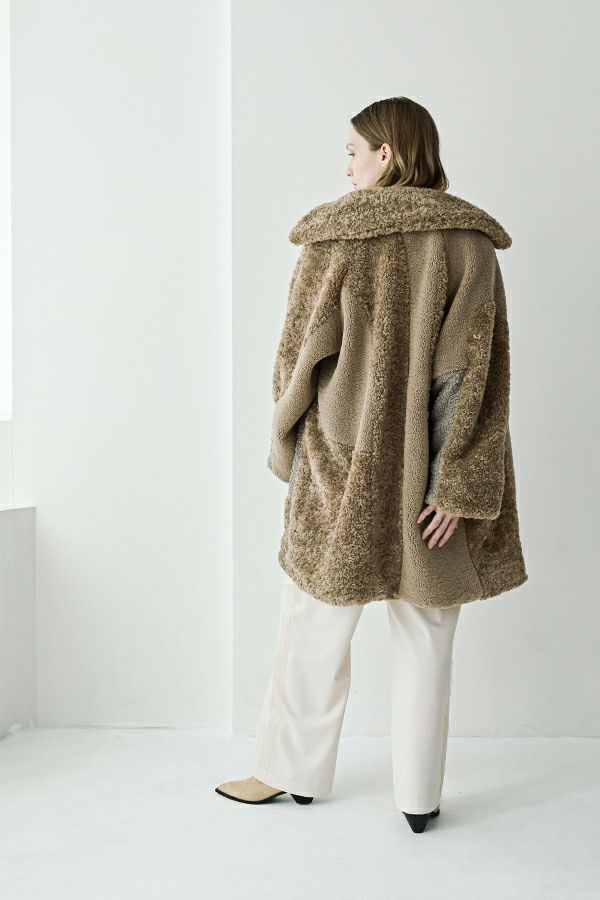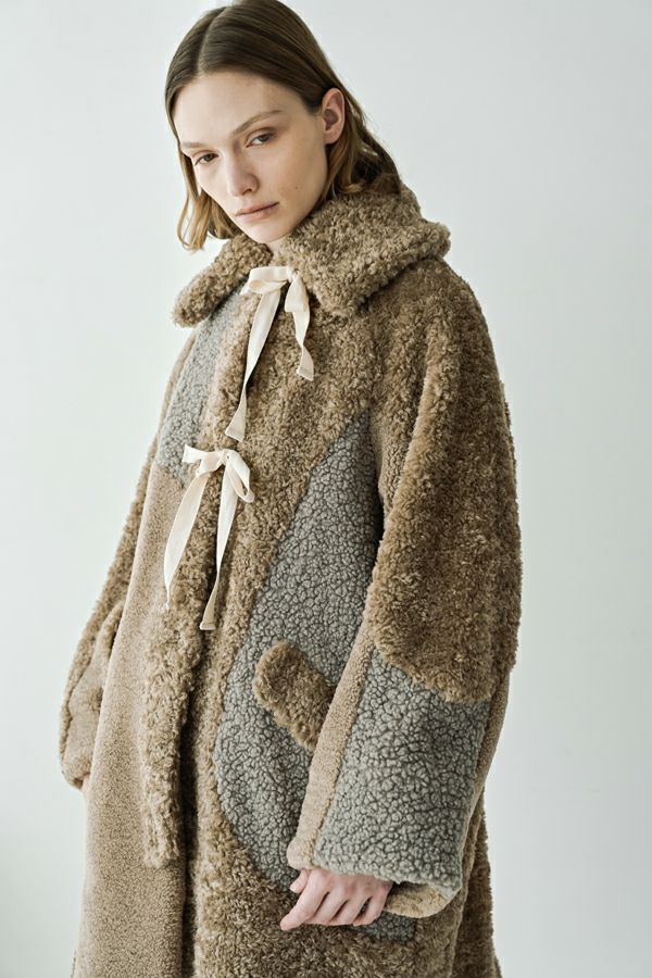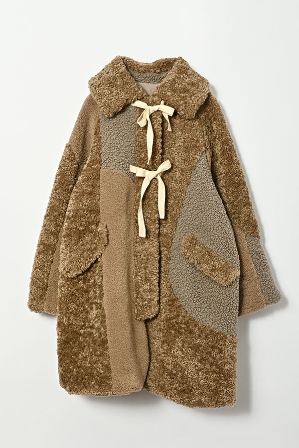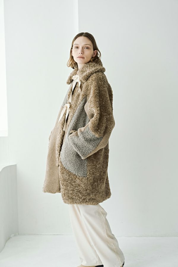 感性を纏う。存在感で魅せるボアパッチワークコート。 3種の異なるフェイクボアをアシンメトリーに切り替え、感度の高いパッチワークデザインに仕上げた一着。全体をゆったりと包み込むオーバーシルエットに、大きめのステンカラーが顔まわりをふんわりと包み、リラックス感とモードな存在感を両立。 フロントはスナップボタンと太幅のリボンテープを添えて、ラフに留めるだけでニュアンスのある佇まいに。羽織るだけでスタイリングが決まる、主役級アウターです。 デニムやカーゴパンツなどカジュアルなボトムとも相性良いです。スウェット×デニムにさっと羽織れば、こなれた大人のカジュアルに。シャツ×スラックスに合わせれば、洗練されたエフォートレスなスタイルが完成